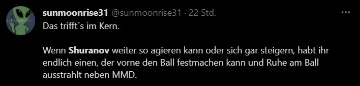 "Якщо Шуранов продовжить в тому ж дусі чи прогресуватиме навіть швидше, в Нюрнберга нарешті з'явиться форвард, який зможе попереду чіплятися за м'яч і спокійно завершувати".