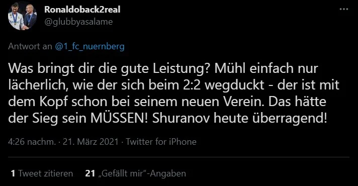 Гол Шуранова міг принести Нюрнбергу, який йде біля зони вильоту другої Бундесліги, сенсаційну звитягу над Гройтер Фюртом, який бореться за вихід у першу Бундеслігу. Однак на останніх секундах гості втратили перемогу. "К*рва! – випалив після фінального свистка Роберт Клаус. – Ми були так близькі до перемоги".