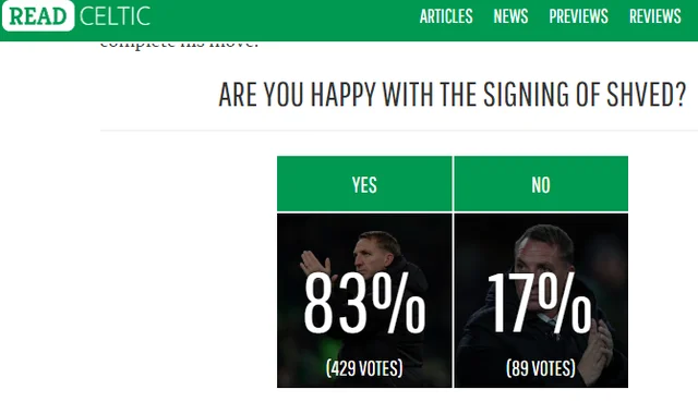 Популярний фанатський ресурс Read Celtic провів опитування, чи задоволені підписанням українського вінгера вболівальники "обручів". Відразу 83% схвалили трансфер Шведа, а майже 90 фанів проти. У мережі думки розділись за схожими пропорціями.