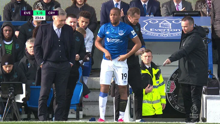 Француз вже готувався замінити травмованого Волкота, і коли нахилився поправити ліву гетру, то виявив, що її нема. Гравцю довелось бігти до роздягальні, через що Евертон певний час грав у меншості.