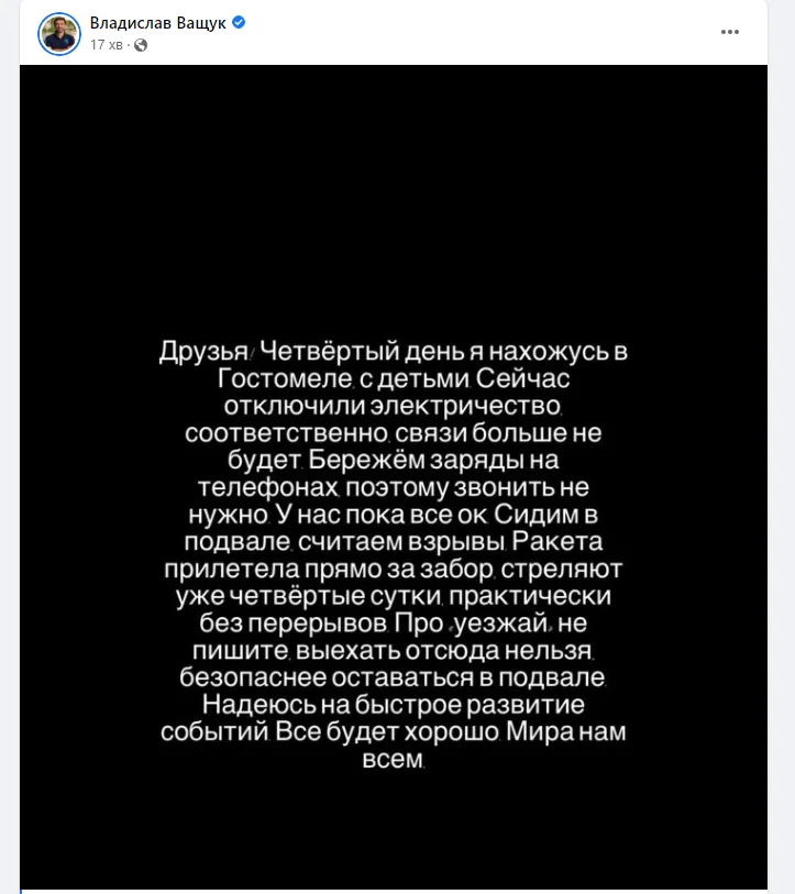 "Друзі! Четвертий день я перебуваю у Гостомелі з дітьми. Зараз вимкнули електроенергію – відповідно, зв'язку більше не буде. Бережемо заряди на телефонах, тому дзвонити не треба.