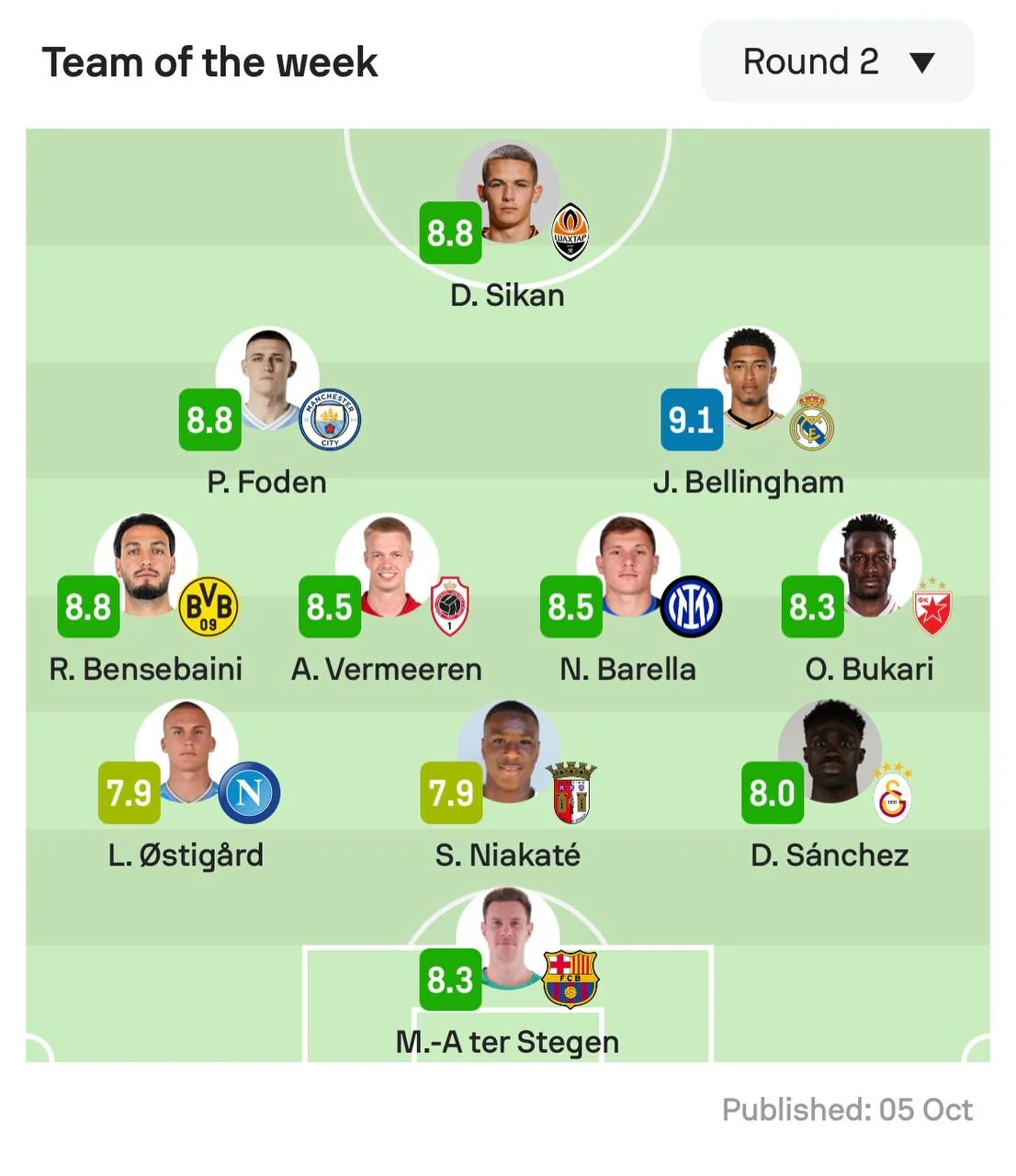 Півзахисники: Рамі Бенсебаїні (Борусія Д), Артур Вермерен (Антверпен), Ніколо Барелла (Інтер), Осман Букарі (Црвена Звезда), Філ Фоден (Манчестер Сіті), Джуд Беллінгем (Реал).