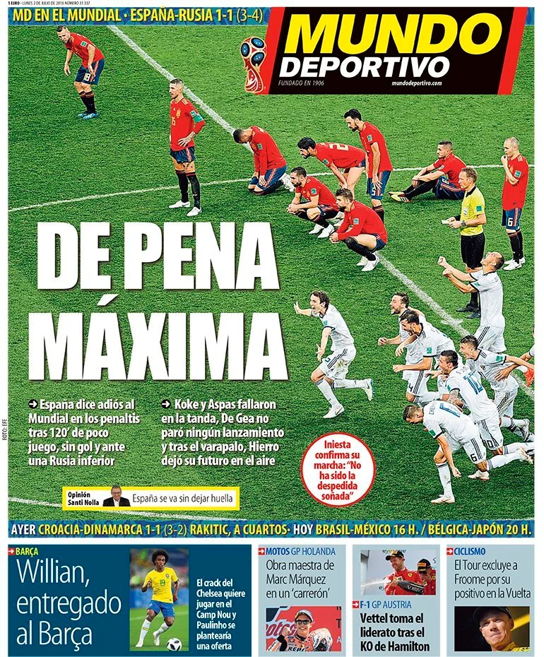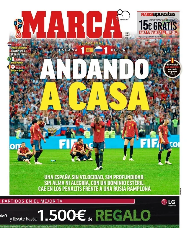 Marca вже на своїй першій шпальті вказує основну причину поразки збірної Іспанії на Лужниках: "Пішки додому". Авторитетне видання зазначає, що команді Єрро не вистачало швидкості, душі та енергії.
