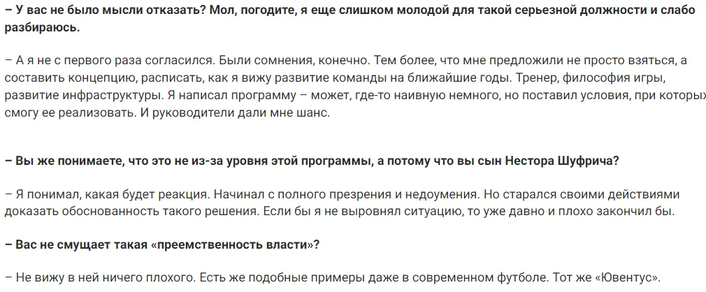 Батько, мабуть, звертає увагу хіба на результати команди, але я не можу сказати, що він любить футбол, бо за півтора роки жодного разу не бачив його на наших матчах. Розмовляючи ж із Олександром Несторовичем, висновки інші: він футбол любить. Але, розумієте, дуже багато розмов та обіцянок, а нічого не виконується. За півтора роки я не пам’ятаю жодного випадку, коли б Олександр Шуфрич щось сказав, а потім зробив. Жодного разу не було, щоби він відповів за свої слова.