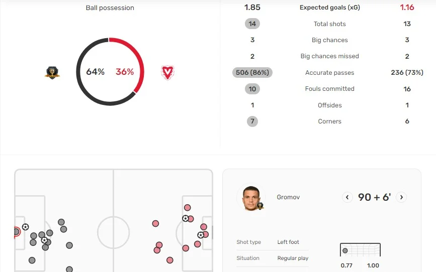 Довбик у силовому стилі протягнув, стінка не пройшла, але Адамюк перехопив і віддав. Снаряд пролетів красиво, проте над воротами. Ще далі від взяття воріт був Хамаш. Не вдалося здалеку, розіграли у штрафному. Рубчинський відібрав перед периметром, Піхальонок підхопив і віддав ліворуч. Бусанелло прострілив, захисники застигли в часі, а Довбик вискочив з-за їхніх спин і розстріляв голкіпера. Бабенко а-ля Макелеле у вивірених підкатах біля своїх воріт розправляється відразу з двома суперниками. Жорстко, але за правилами і красиво.