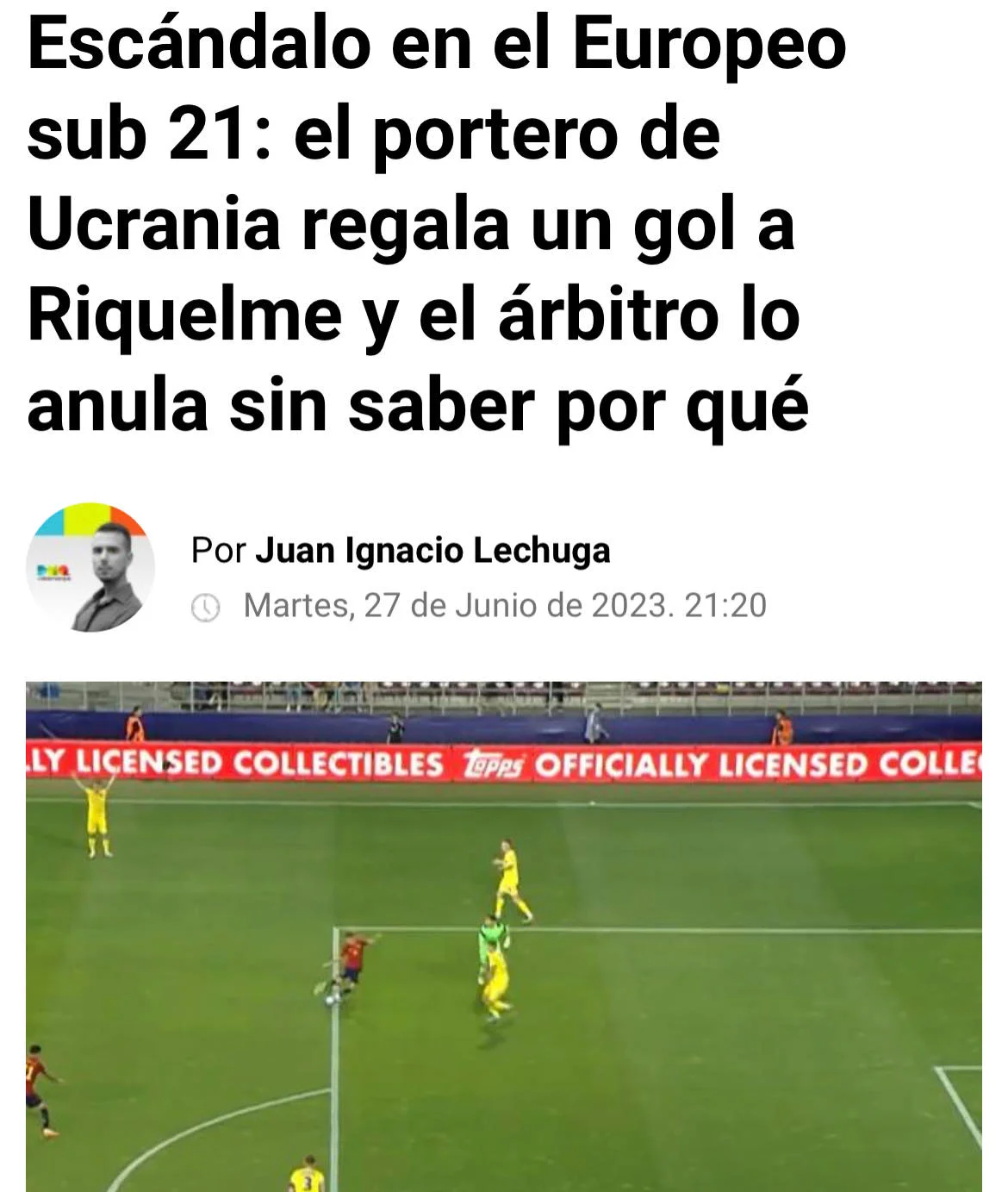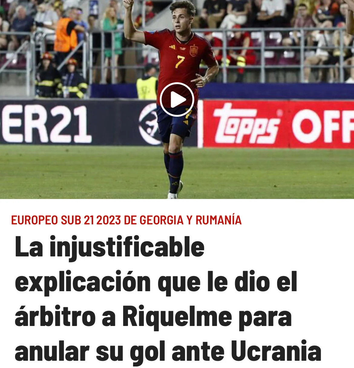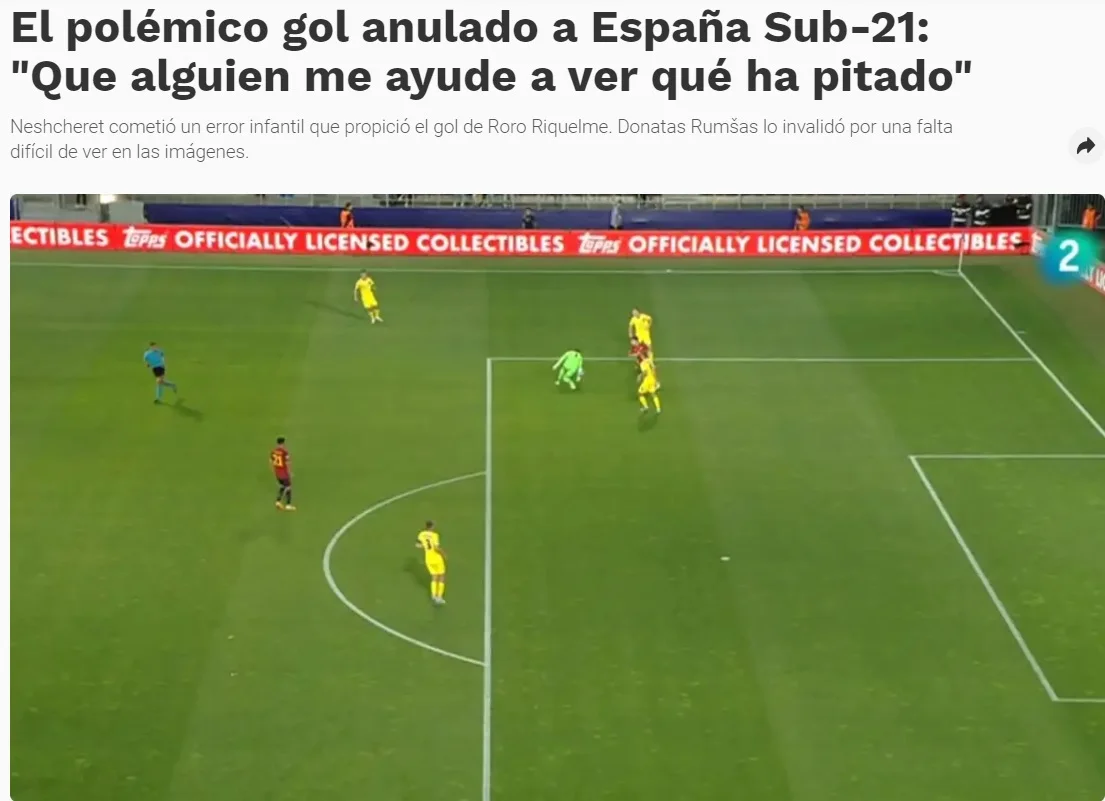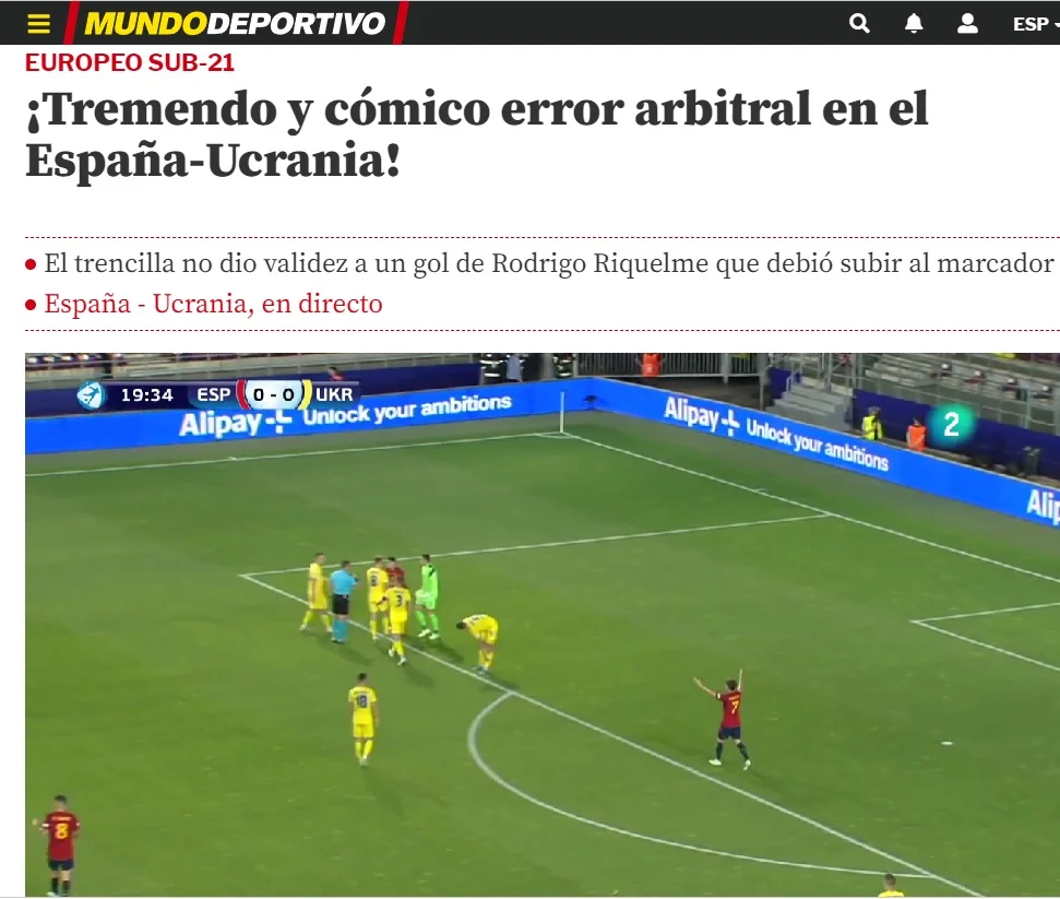 Іспанія U-21 провела проти України третій матч групового етапу чемпіонату Європи. Зустріч за лідерство у групі. Санті Денія провів серйозну ротацію. Іспанія добре стартувала, домінувала, та моменти з’являлись після помилок українців. Рікельме, зокрема, відгукнувся на передачу з глибини, але не зміг наздогнати м’яч. Щоправда, голкіпер несподівано втратив сферу. Роро швидко зорієнтувався і забив. Усе виглядало настільки дивно, що навіть рефері не повірив у законність гола. Це вже друга скандальна помилка на турнірі без VAR.