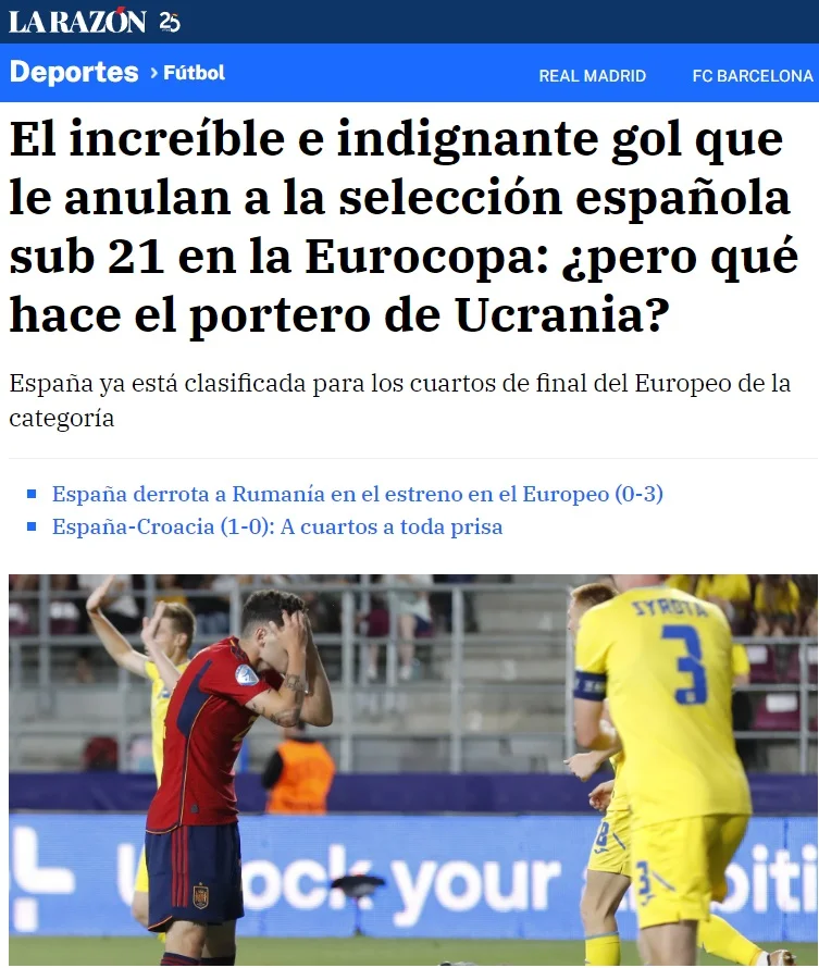 Україна розписала феєричну нічию з Іспанією у третьому турі молодіжного Євро-2023. Скандальний момент зі скасованим голом у ворота "синьо-жовтих" спантеличив іспанські ЗМІ.