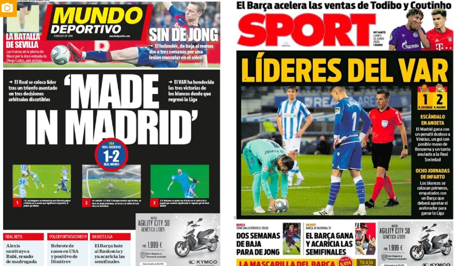 Diario SPORT розповідає про "лідерів VAR". Друга за популярністю спортивна газета Каталонії, крім трьох найбільш обговорюваних моментів, обурюється діями Каземіро, який ліктем перевірив на міцність щелепу суперника. Той епізод, можливо, заслуговував інтервенції відеоасистента з прямою червоною, тоді як Естрада Фернандес обмежився жовтою карткою.