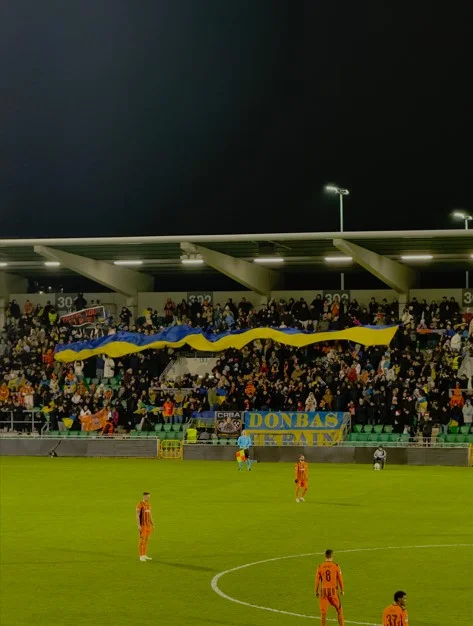 У цей момент стався ще один епізод, який точно запам’ятався: коли футболісти вже вишикувались і почали рукостискання, над стадіоном раптом пролунала сирена. Для українців реакція могла бути лише одна – короткий ступор і внутрішній спазм, адже такий звук у нашому досвіді означає зовсім інше. Але за секунду стало зрозуміло, що це лише частина місцевого передматчевого супроводу: щось на кшталт інтригуючого музичного вступу, яким Шемрок Роверс створює атмосферу перед стартом гри.