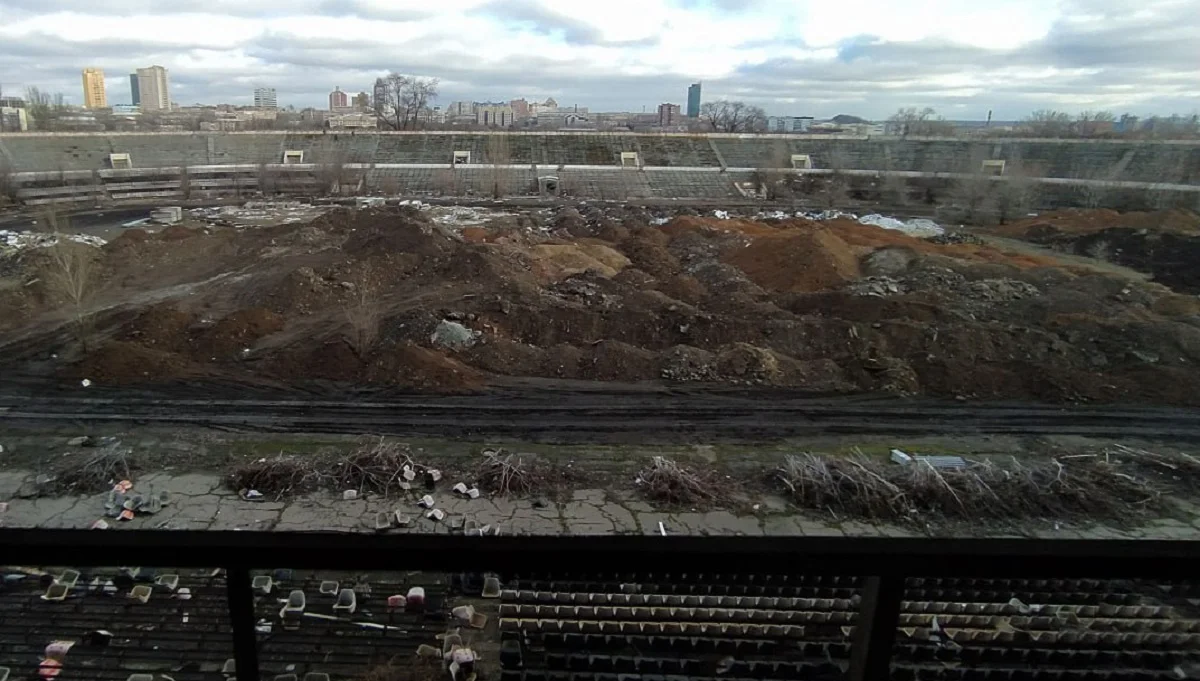 Стадіон Шахтар у Донецьку нині перебуває у жахливому стані. Колись головна арена Донбасу перетворилась на занедбане звалище. В центрі стадіону замість футбольного поля тепер ведуться розкопки, завозиться грунт з комплексу, який будується поруч. Також на відкритому майданчику розкидані будівельні матеріали та сміття.