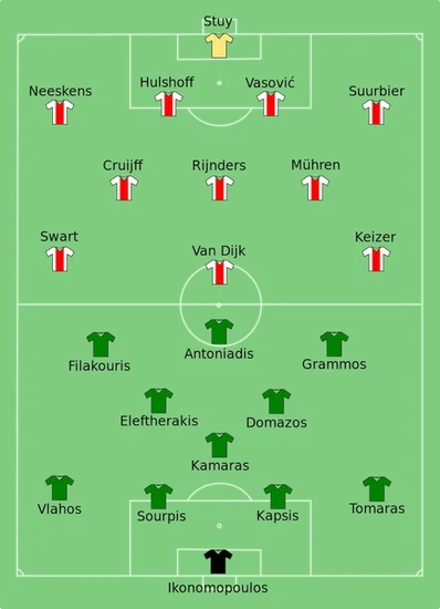 Перед грою з Аяксом футболісти Панатінаїкоса отримали "непристойні пропозиції" від грецьких жінок-селебріті. Кінозірка Зета Апостолу обіцяла провести вихідні на Криті з воротарем Такісом Ікономопулосом, якщо він не пропустить на Вемблі; колишня Міс Греція Зої Ласкарі пообіцяла "вічні поцілунки" для гравців у разі перемоги, а співачка Зозо Сапоунтракі в разі успіху Панатінаїкоса у Лондоні запрошувала всю команду до себе додому для "незабутніх вихідних". Але гравці ПАО втратили своє щастя – Антоніадіс не реалізував дві гольові нагоди, і Аякс із Йоханом Кройфом у складі здобув перемогу з рахунком 2:0.