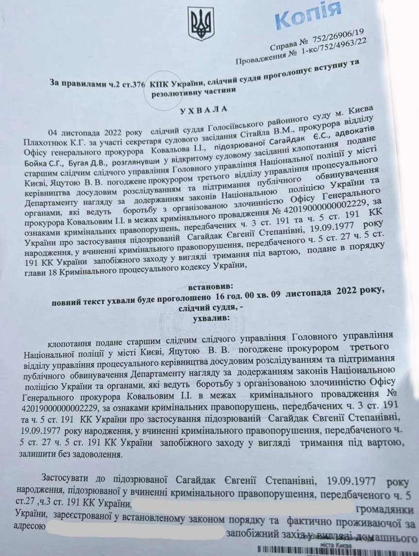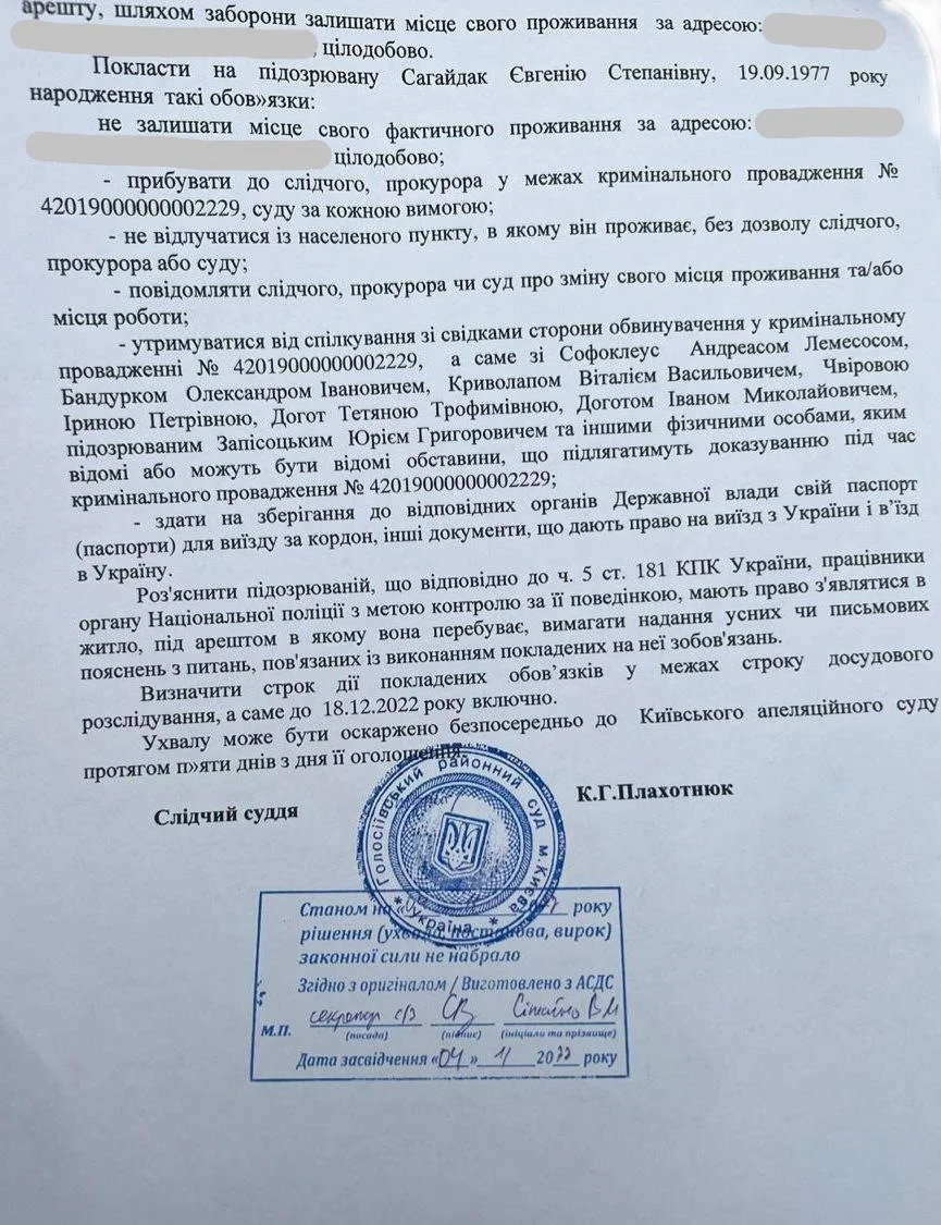 Прокуратура просила застосувати підозрюваній запобіжний захід у вигляді тримання під вартою, але суд не задовольнив це клопотання. Суддя Плахотнюк Катерина Григорівна вирішила обмежитися лише домашнім арештом шляхом заборони залишати місце свого фактичного проживання. Також у Сагайдак вилучили закордонний паспорт.