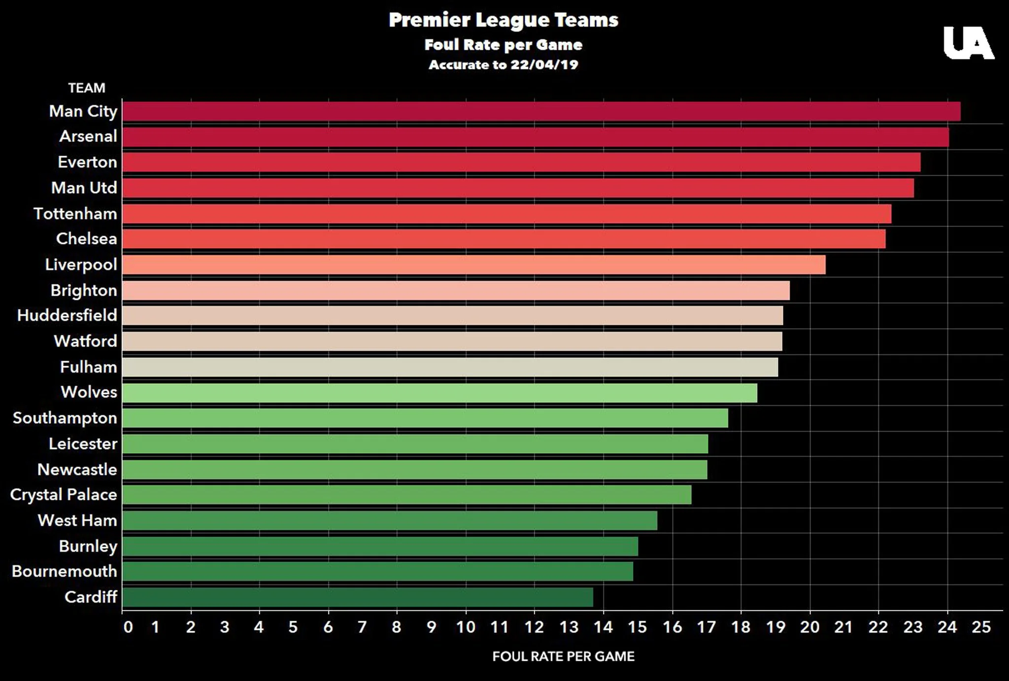Втім, якщо скоректувати показники на володіння, взявши до уваги лише час, який команди проводять на полі без м'яча (протягом якого й здійснюються фоли), то вийде, що Манчестер Сіті (при володінні 64% – найбільше в чемпіонаті) найчастіше в АПЛ порушує правила. Тобто тактика дрібного фолу зразу після втрати м'яча в "містян" дійсно є.