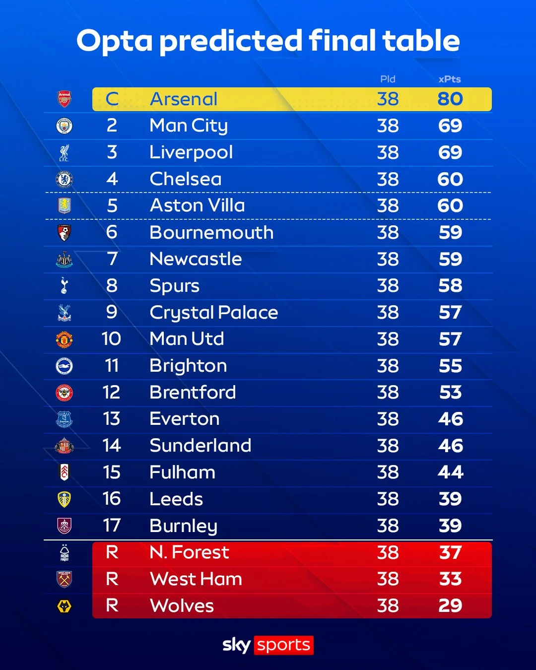 Sky Sports у соцмережі X опублікував підрахунки суперкомп'ютера Opta щодо результатів англійської Прем'єр-ліги у сезоні 2025/26.