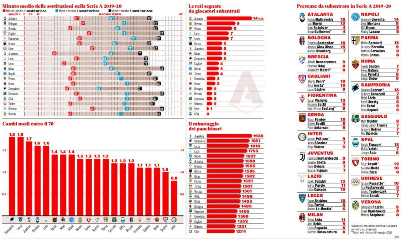 Парадокс у тому, що саме наставник бергамасків повинен найбільше радіти збільшенню кількості можливостей випустити свіжого футболіста. Річ у тім, що до вимушеної зупинки сезону саме запасні Аталанти були найбільш ефективними. Так, Мауріціо Саррі найчастіше вдається до ротації протягом матчів – гравці Ювентуса, які розпочинали поєдинки на лаві запасних, сумарно зіграли 1938 хвилин. Клуб із Бергамо за цим показником лише шостий (1598 хвилин). Однак гравці "Старої синьйори" після виходу на заміну забили п'ять голів, тоді як Аталанта тут впевнено лідирує – 14 забитих м'ячів. Теоретично, найбільше повинен постраждати Інтер. Резервісти Антоніо Конте забили всього один м'яч (гірше тільки у СПАЛа (0)). В такій ситуації доводиться думати не про боротьбу з Юве і Лаціо за чемпіонство, а про те, як захистити "бронзу" від зазіхань Аталанти.