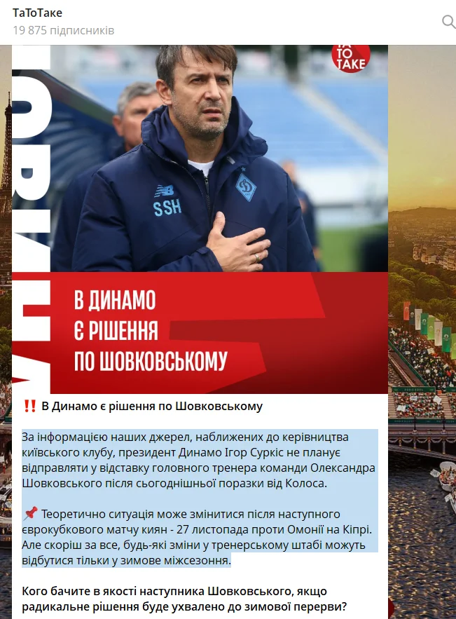 Нагадаємо, що Олександр Шовковський з листопада по грудень 2023 року виконував обов'язки головного тренера через хворобу Мірчі Луческу, а потім повноцінно замінив його на посаді наставника команди. Шовковський виграв з Динамо титул чемпіона України у сезоні 2024/25.