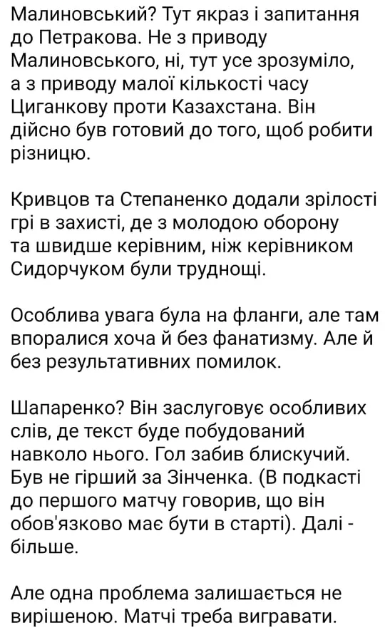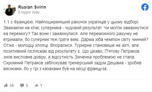Поки підсідаємо в останні півгодини, не стало сил в кінці вибігати в контратаки. Але знаєте, мені подобається ця збірна України. І з французами, і навіть з казахами. За рухом, малюнком гри, самовіддачі. Подобається більше, ніж команда Шевченка:)