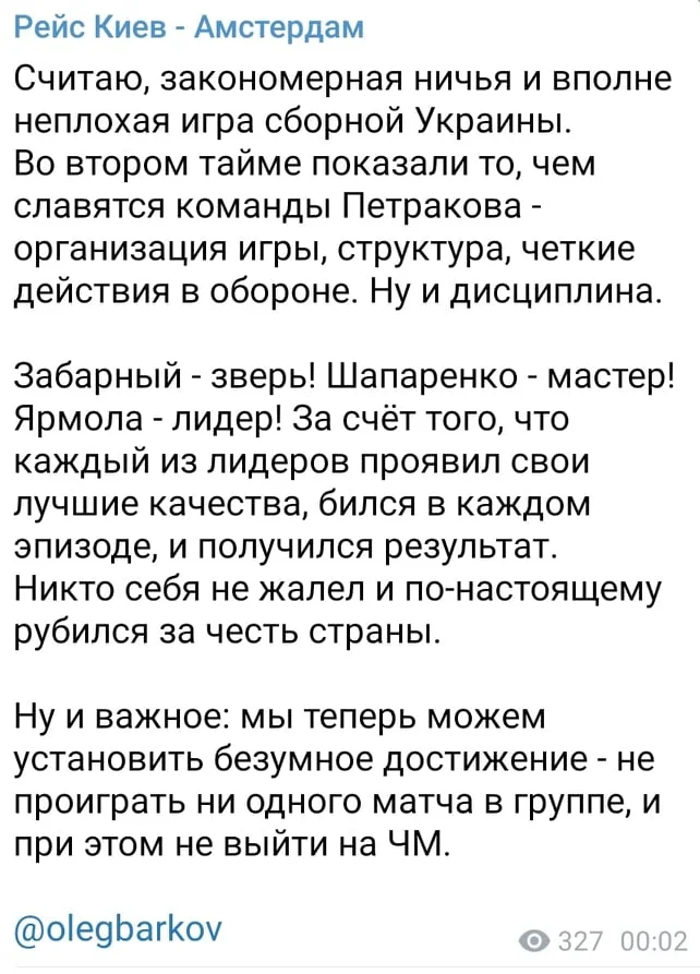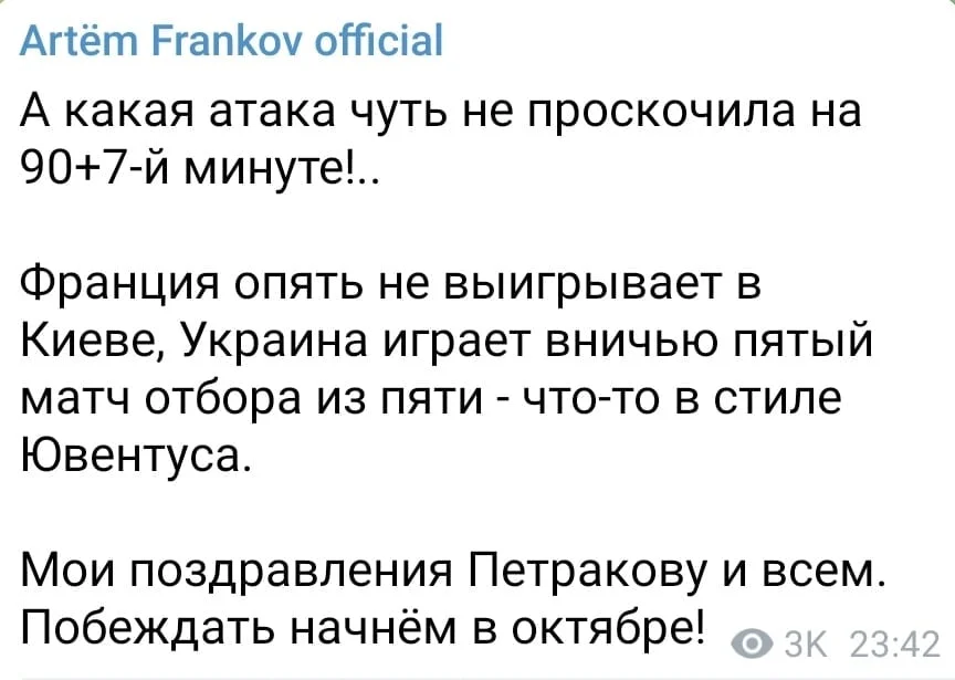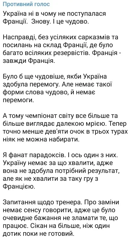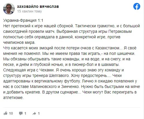 Отличная игра. 1:1 против Франции. Это совсем другая сборная Украины. Тактически очень грамотно, структура и организация, дисциплина и компактность. Спасибо ребята за такой футбол!