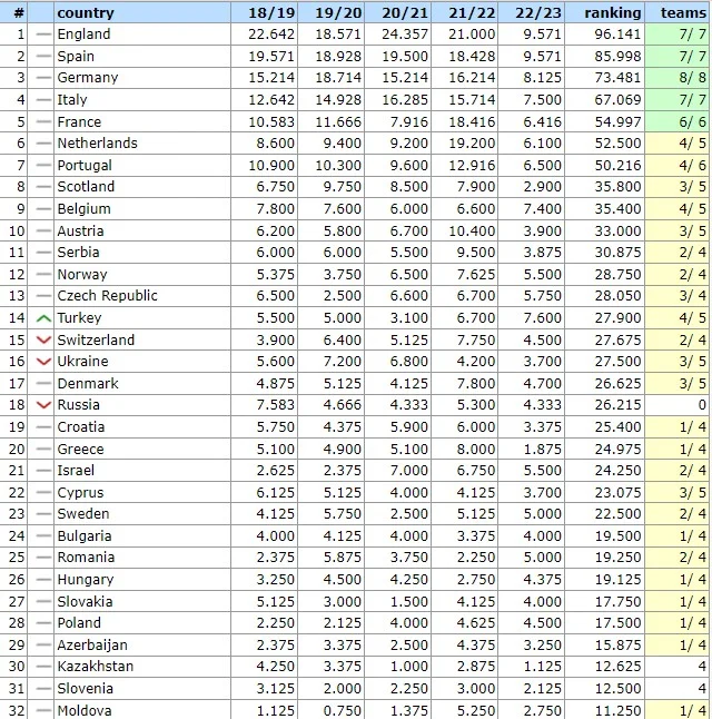 Водночас потрібно не забувати, що твориться за спиною. Хорватія і Греція синхронно провалилися. Останні разом зі Шотландією – головні лузери сезону в топ-20. Греки не набрали й 2 балів. У шотландців менше 3. А ось Данія загрозливо набирає темп. Скандинави відстають тепер лише на 0,875. За сезон ми підпустили данців на 1 бал, тому така перевага – ніщо з нашими темпами тринькати запаси. Наївно сподіватися, що в один момент вони самі зупиняться. Україна замикає лише топ-25 за набраними очками у поточному сезоні – треба прокидатися. Наші клуби поповнили скарбничку на стільки ж, скільки Кіпр (3,7). А тому матчі Динамо і СК Дніпро-1 проти АЕКа та Аполлона у 5 турі набирають подвійного значення.