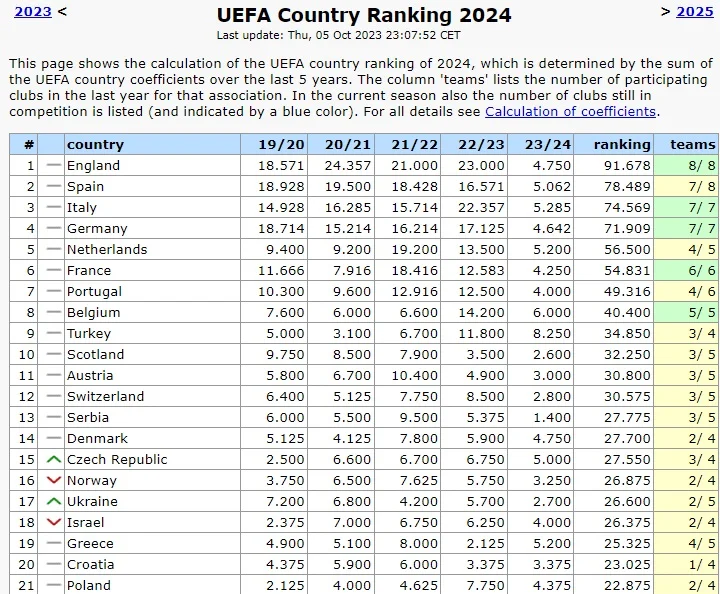 Як наслідок, Шахтар і Зоря принесли Україні 0,8 бала в таблицю коефіцієнтів УЄФА. Найкращий результат у сезоні 2023/24 дозволив нам піднятися на одну позицію. Україна обійшла Ізраїль та посідає 17 сходинку рейтингу асоціацій.