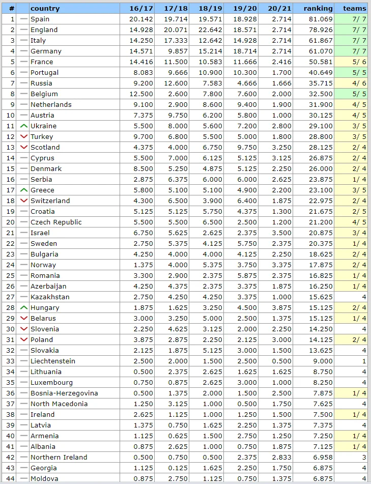 Таким чином, успіх Динамо дозволив Україні піднятися на одинадцяту сходинку і випередити у рейтингу Шотландію та Туреччину. До слова, 10-е місце в таблиці коефіцієнтів гарантує країні пряму путівку у груповий розіграш Ліги чемпіонів. Наразі Україна відстає від Австрії на 1,025 бала (6 очок), Туреччину випереджає на 0,3 бала (2 очки), а Шотландію – на 0,975 (5 очок).