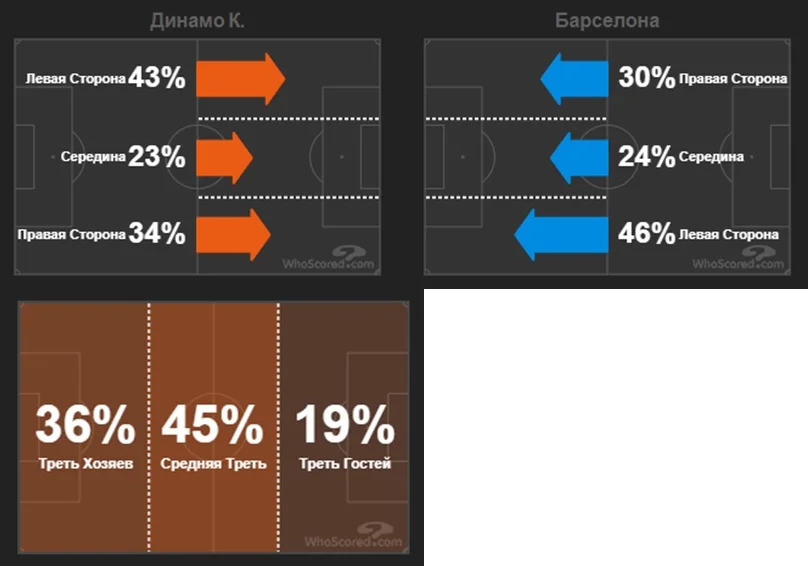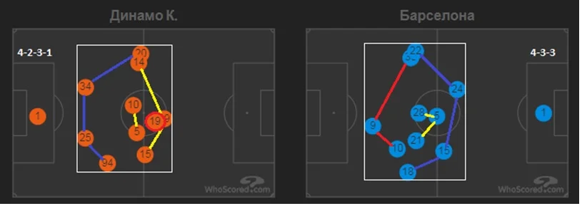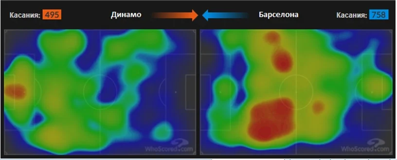 Барселона традиційно і передбачувано більше володіла м'ячем, що чудово відображає теплова мапа. Динамо переважно дотримувалося зонних методів оборони, тримаючи структуру 4-4-2 у середньому блоці. У конструктивній фазі гри господарі поля робили ставку на організацію швидких атак.