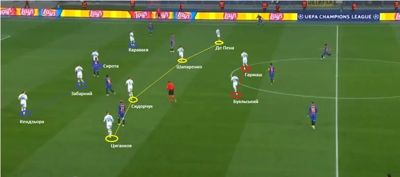 На скріншоті вище – структура Динамо у позиційній обороні. Взагалі, господарі поля досить якісно діяли у деструктивній фазі гри, дисципліновано тримаючи вертикальну та горизонтальну компактність. Варто окремо зупинитись на першій лінії оборони, яка складалася з Гармаша та Буяльського. Цей тандем збалансовано поєднував тиск на центрбека з м'ячем і нейтралізацію системотворчого гравця Барселони – Бускетса. Вони почергово висувалися на захисника, тримаючи вектор можливої передачі на Серхіо. До того ж, Гармаш або Буяльський фактично тримали під опікою самого півота, як в Іспанії називають творчого опорника.