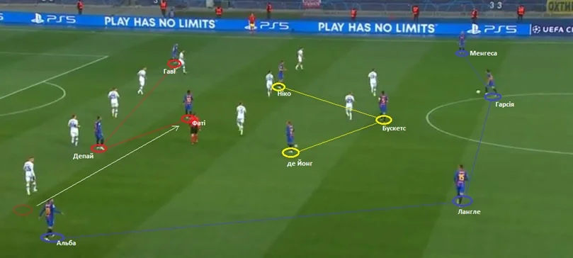 Обидві команди в атакувальних діях завалювалися на свій лівий фланг. Особливо це стосується Барселони. У позиційних атаках гості переважно намагалися розкрити оборону Динамо саме через фланг Альби та Фаті, де їм активно допомагав Френк де Йонг. Саме він діяв на позиції лівої "вісімки", тоді як юний Ніко Гонсалес Іглесіас грав ближче до правого флангу.