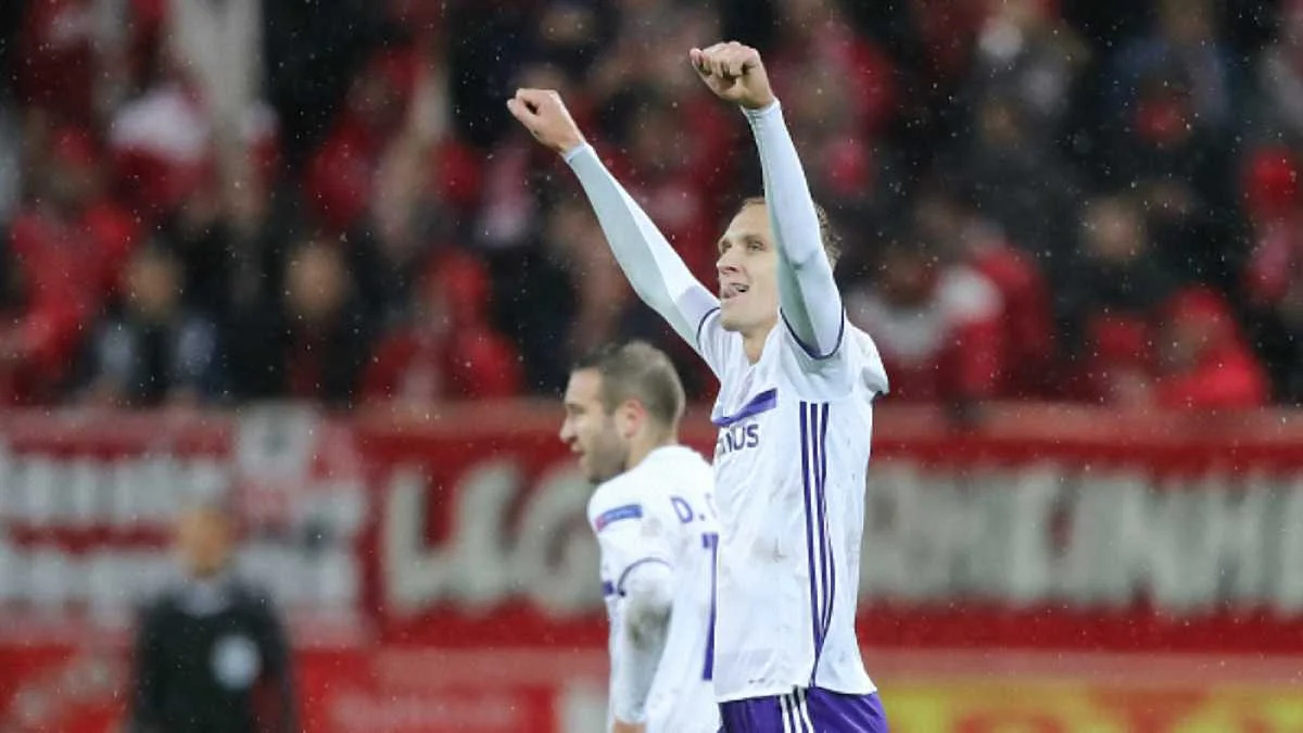 Польський нападник Лукаш Теодорчик забив м'яч у поєдинку "Андерлехта" проти "Кортрейка".