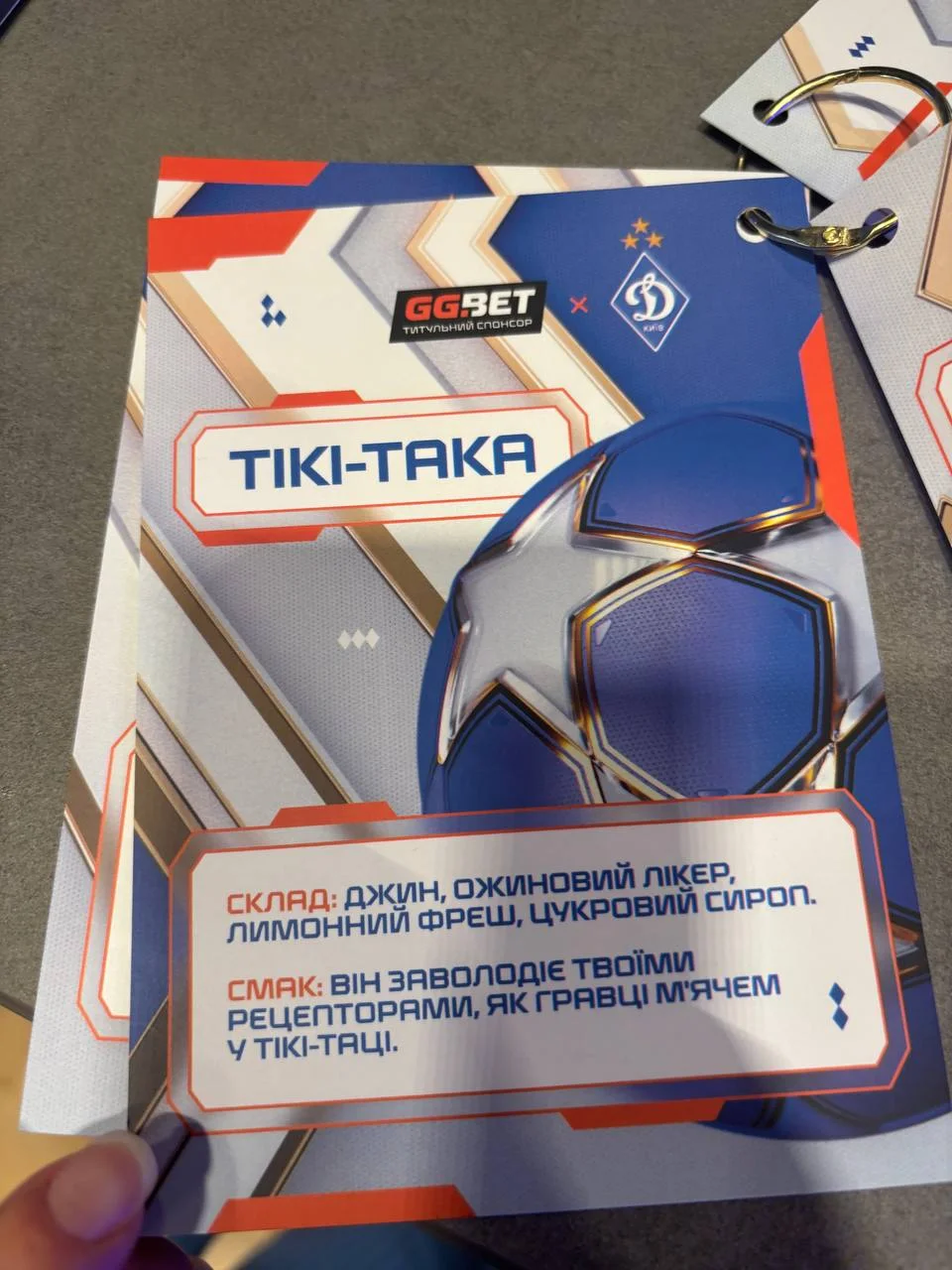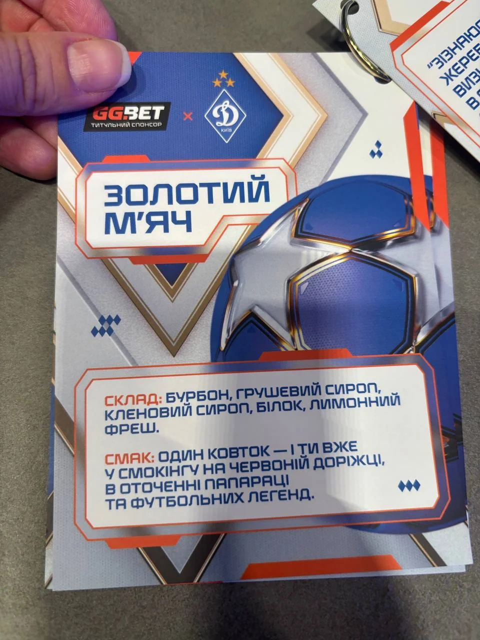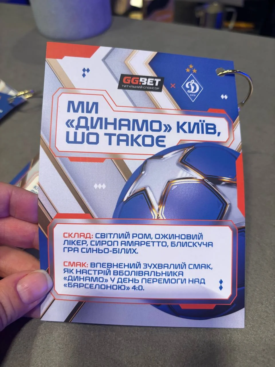 Після офіційної частини настала черга спілкування. Динамо з GGBET креативно підійшли до наповнення бару – можна було замовити “футбольні коктейлі”. Чотири види з різними смаками – "Ми Динамо Київ, шо такоє", "Золотий м’яч", "Тікі-така" та "Паненка". Кожен коктейль мав свій опис. Жодного так і не спробувала, але задум оцінила.