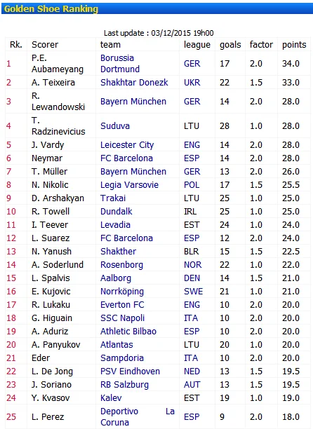 Очолює список бомбардирів габонський нападник дортмундської "Борусії" П'єр-Емерік Обамеянг, 17 голів якого у Бундеслізі множаться на коефіцієнт чемпіонату 2 і дають в сумі 34 бали.