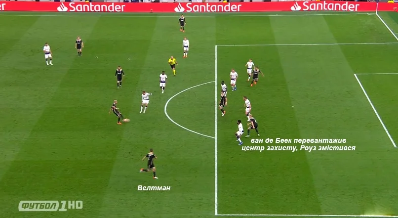 Від "шпор" можна було очікувати виходу в три захисники, хоча це здавалося малоймовірним. Тим не менш, саме так і сталося: Санчес вийшов в обороні, Ваньяма розташувався над нею, а Роуз і Тріпп'єр грали вінгерів. Задум не спрацював абсолютно – амстердамці домінували в центрі поля й завдяки цьому перевантажували зону центрбеків, змушуючи вінгерів Тоттенхема йти на допомогу й відкривати свою зону, чим користувалися фланги Аякса. При цьому сама якість взаємодії лінії була низькою, завдяки чому ван де Беек і забив.