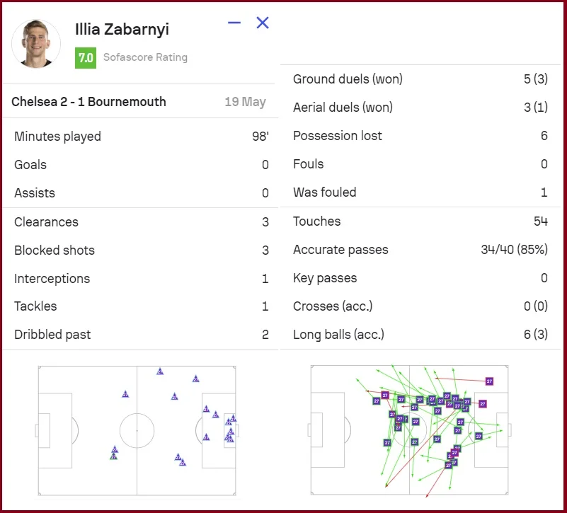 Челсі навесні набрав форму та врятував сезон виходом в єврокубки. Михайло Мудрик не зіграв заключний матч через травму голови, тому Іллі Забарному (який зіграв 37-й повний матч в сезоні АПЛ) довелося стримувати його конкурентів. Кайседо відкрив рахунок ударом з центрального кола! Стерлінг подвоїв перевагу, а Борнмут лише скоротив відставання автоголом.