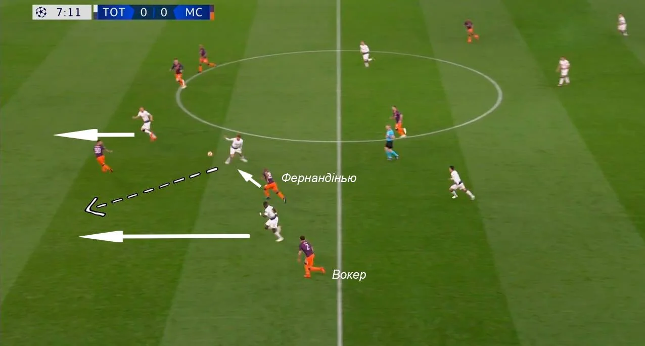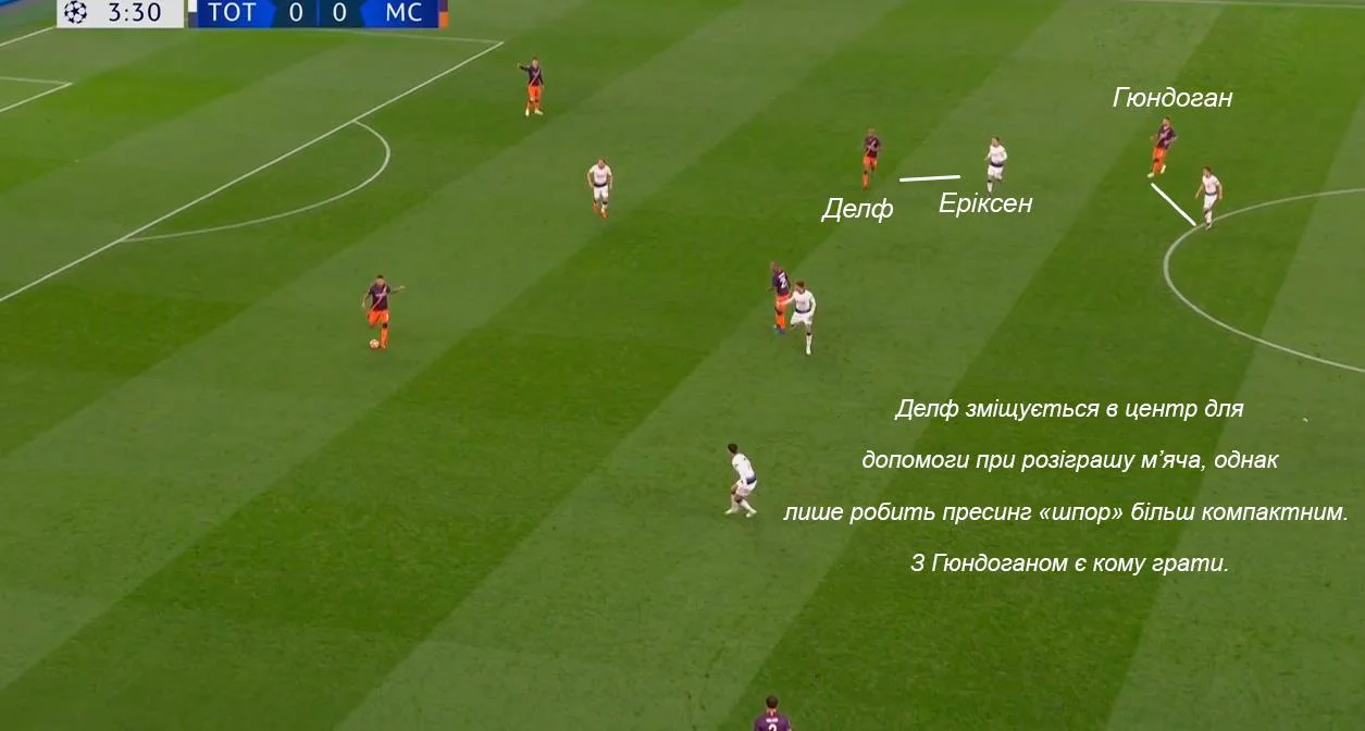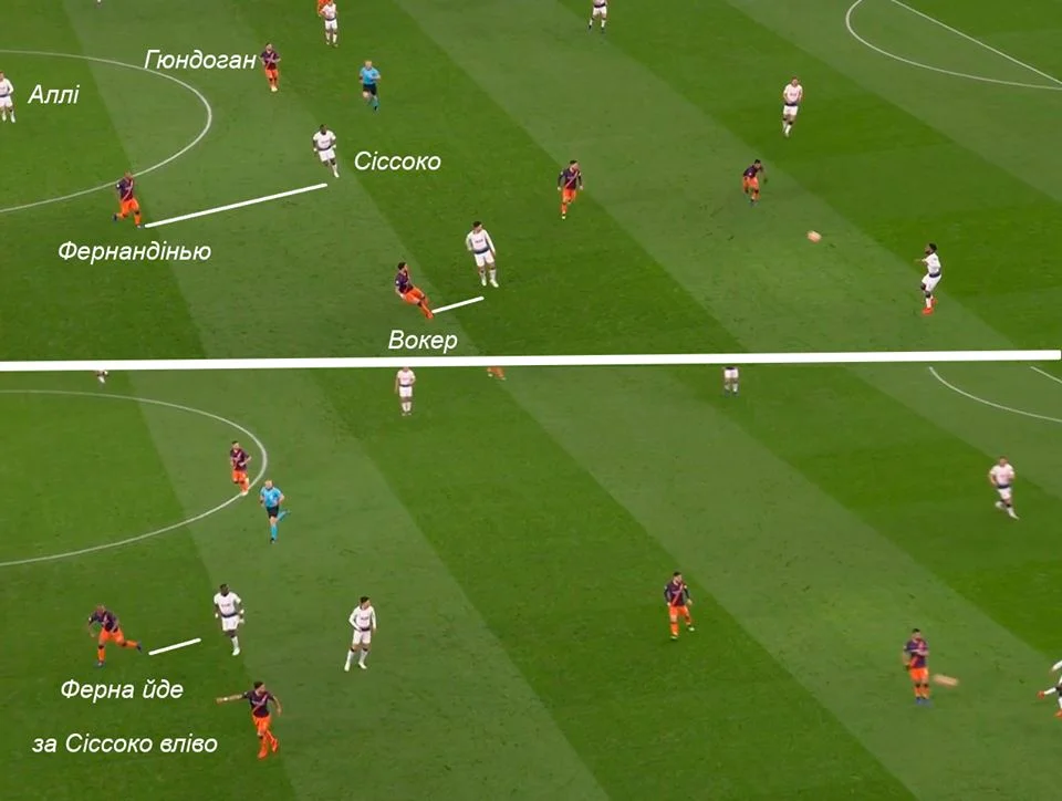 Гра один-в-один по всьому полю при жорсткому пресингу в центрі з боку атакувальних хавбеків призвела до того, що опорники Манчестер Сіті стали розриватися між завданнями. Характерний епізод стався вже на 9-й хвилині, коли "шпори" перехопили діагональ, провели контрвипад і завершили його ударом по воротах. Ситуація стала можливою завдяки тому, що Фернандінью після висмикування Вокера на Сона був змушений залишити за спиною Аллі – в центрі була загроза прориву Сіссоко. Кейн в цей момент прикривав Деле від Отаменді, а Ляпорт та Делф вдвох опинилися далеко на фланзі.