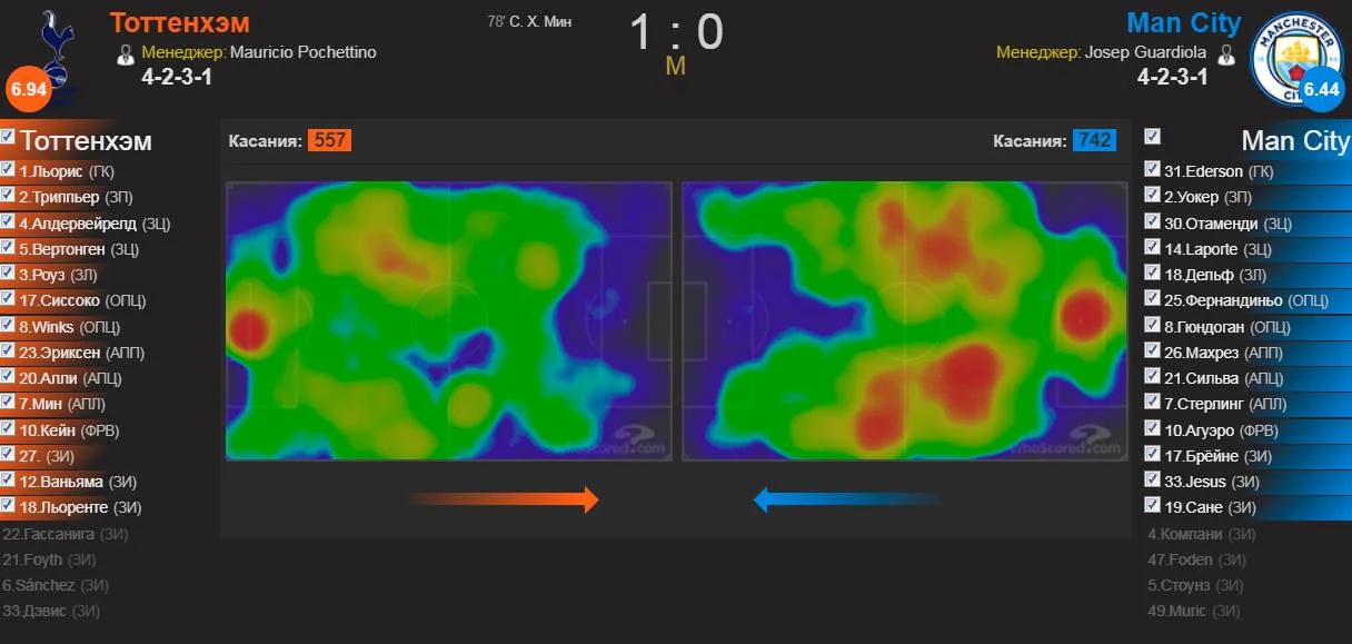 Як наслідок, в системі гри Манчестер Сіті виник дисбаланс, який до самого кінця зустрічі виправити так і не вдалося. Команда 43% ігрового часу атакувала через лівий фланг, в той час як через центр проходило лише 20%. Ще краще картину безпорадності гостей на ключовій ділянці поля демонструє теплова карта – центр поля "містян" просто відсутній. У матчі, в якому 43% ігрового часу команди провели саме у цій третині поля, така пасивність підопічних Гвардіоли була приречена на провал.