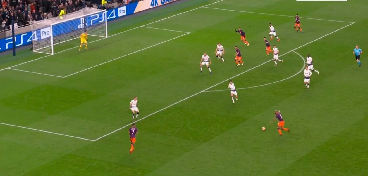 Великою мірою позиційна гра Тоттенхема базувалася на персональних орієнтуваннях та грі один в один, що для матчу проти технічного й швидкого суперника занадто ризиковано. Єдиний небезпечний момент Сіті у другому таймі розпочався саме після того, коли Давід Сілва чи не вперше відклеївся від Вінкса й віддав передачу за спину Сіссоко на хід Гюндогану. Втім, частіше подібні епізоди траплялися на лівому фланзі, де діяв Стерлінг – головний акселератор поодиноких гострих атак Сіті.