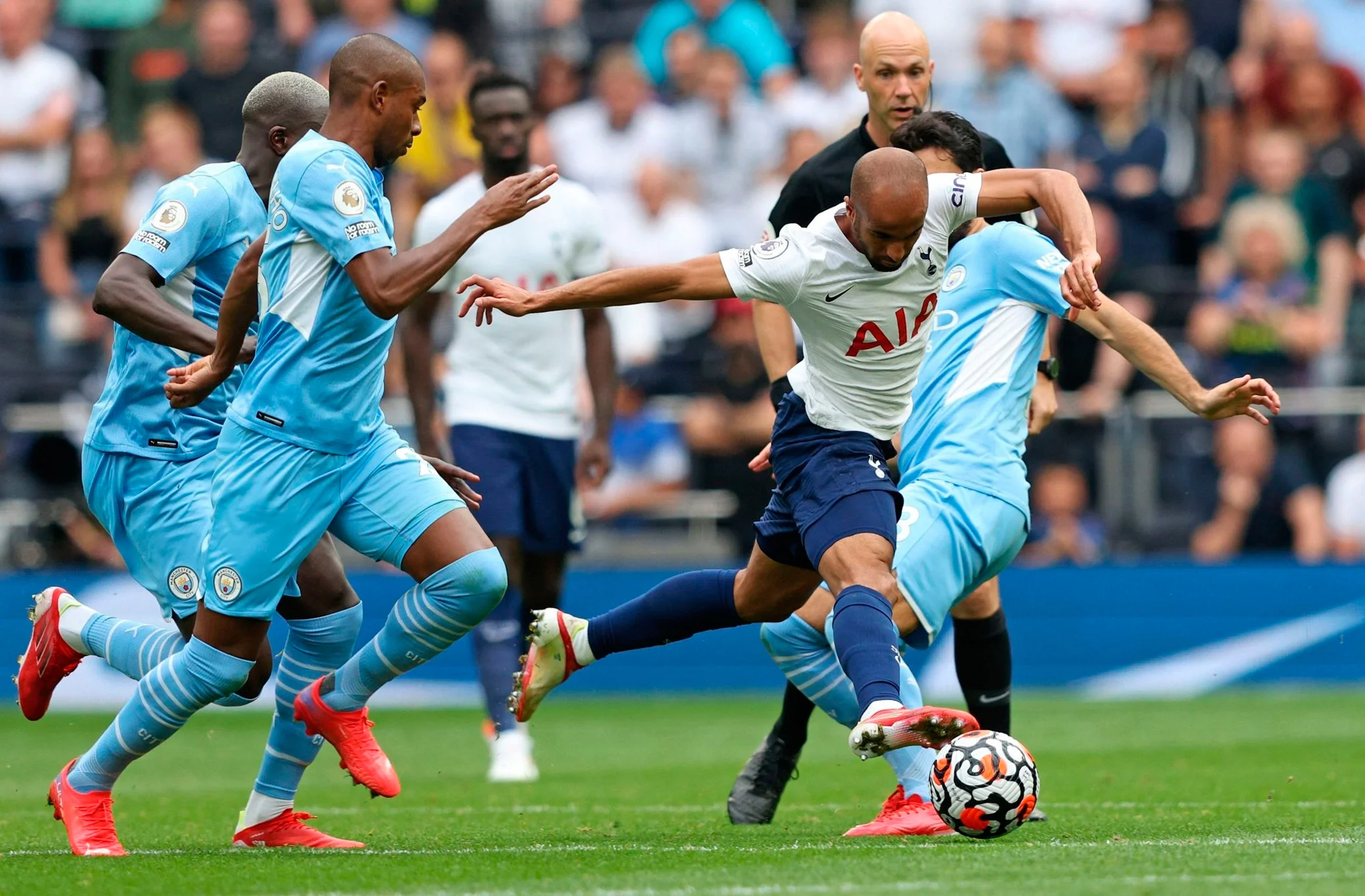 Тоттенхем відповів ще кількома контрвипадами, ледь не відкривши рахунок на 40-й хвилині завдяки удару Сона метрів з 20-ти. Кореєць крутив у дальній кут, але м'яч рикошетом від Канселу пролетів поруч зі стійкою. Зрештою, відпочивати футболісти відправились за нулів на табло.
