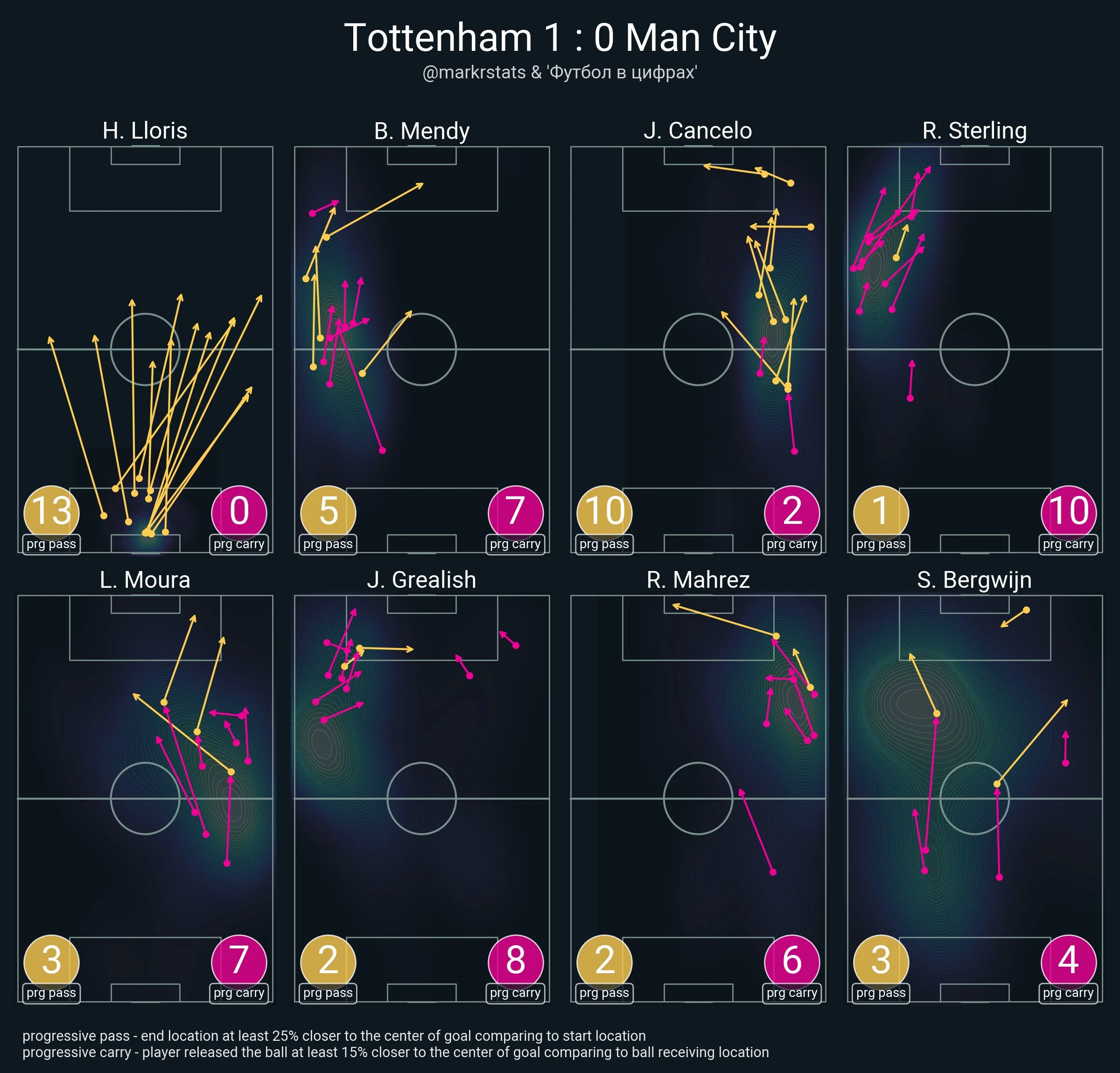 Прогресивні передачі (pass) та ривки (carry) у матчі Тоттенхем – Манчестер Сіті