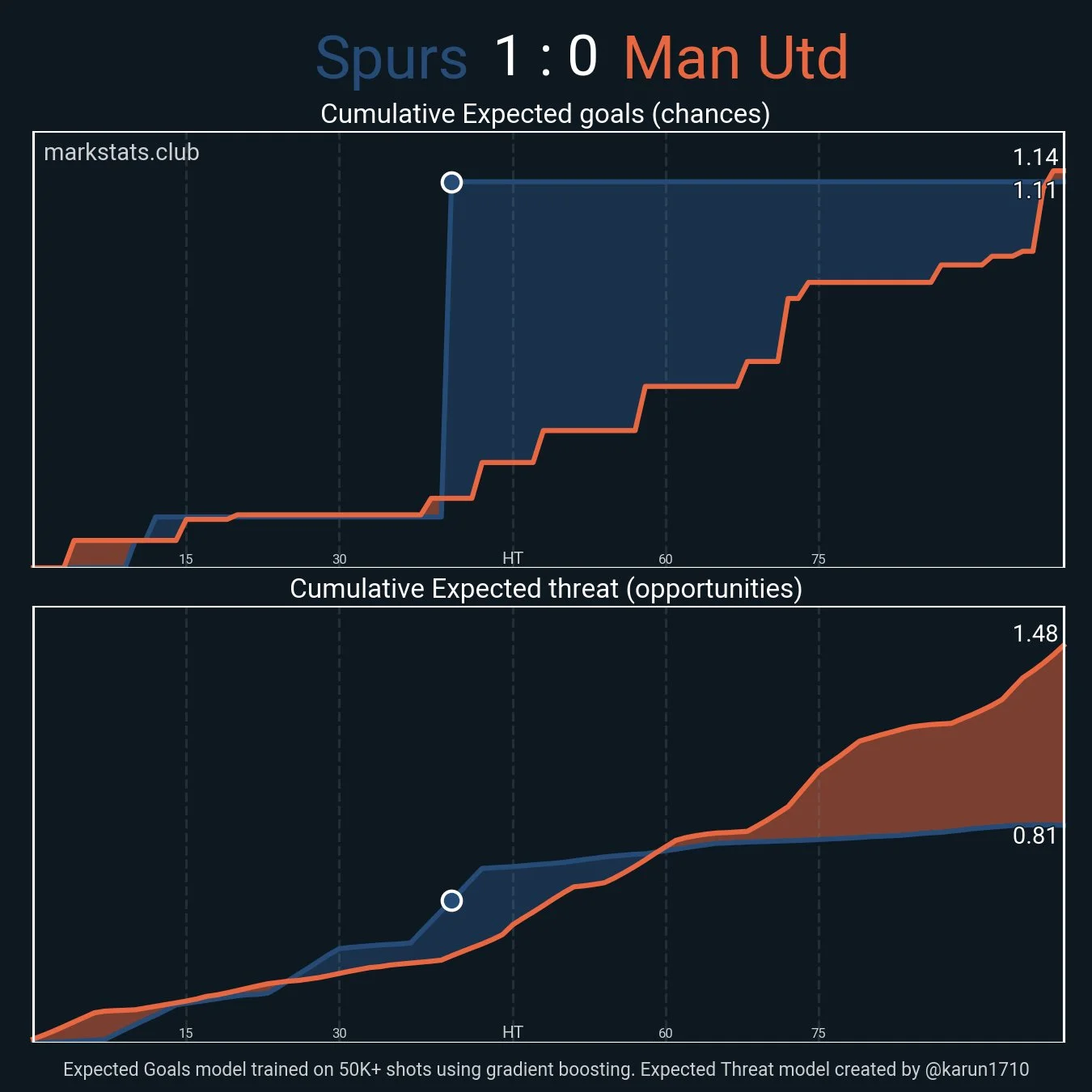 Володіючи ініціативою, "червоні" дияволи" провели всього 7 пострілів в основний час, створивши тільки два моменти. Сумарно підопічні Рубена Аморіма награли на мізерні 0,55 очікуваного гола. І це при тому, що на 71-й хвилині атаку освіжили Гарначо й Зіркзеє.