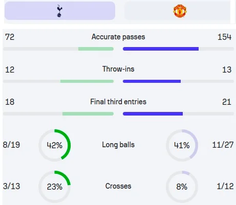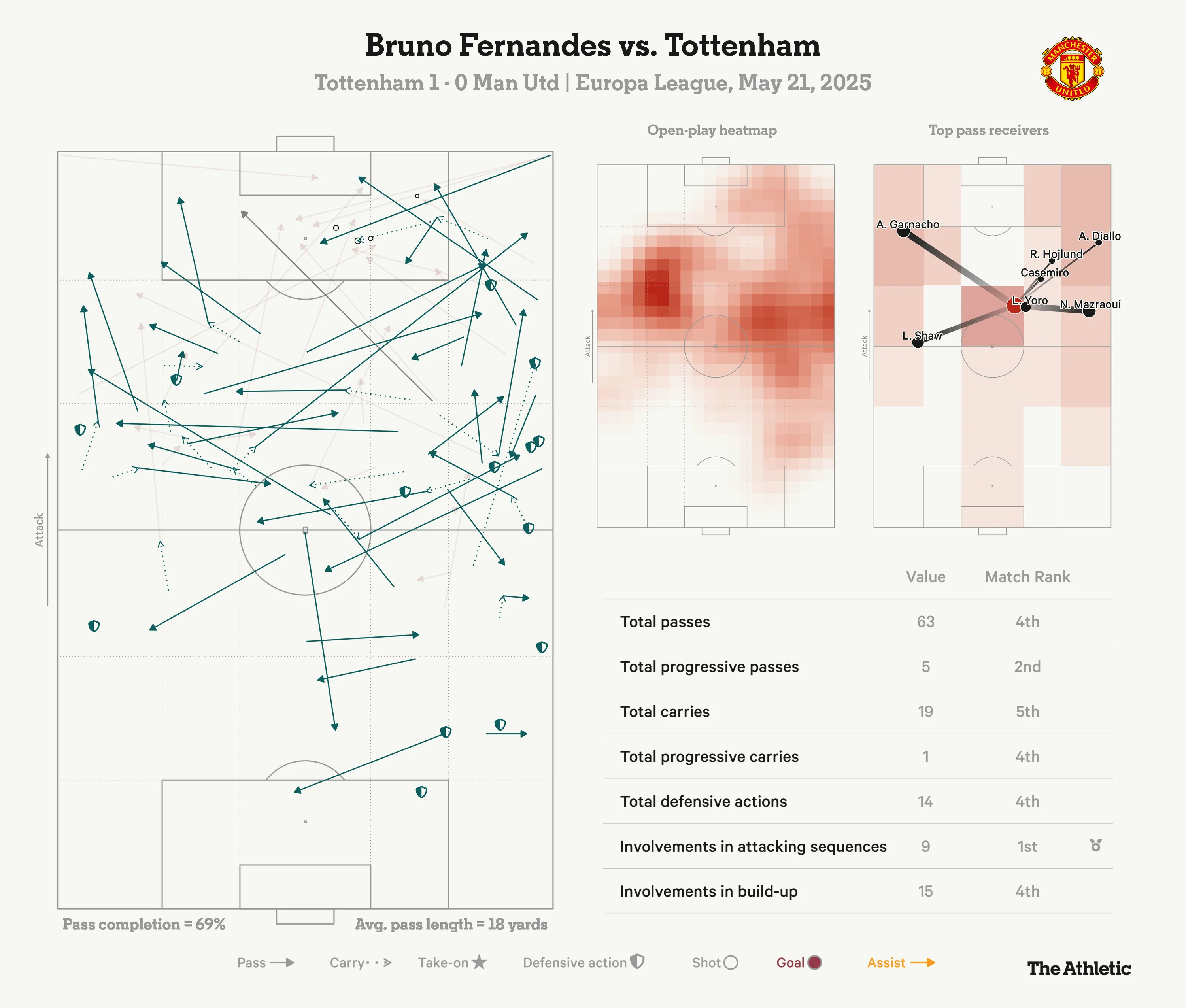 Частково така слабка робота в просуванні пов'язана зі стримуванням Бруну Фернандеша. "Шпори" приділили велику увагу нейтралізації португальця, у якого знову не пішла гра в фіналі. За весь перший тайм капітан МЮ виконав лишень 11 точних передач, хоча в середньому по сезону віддає цілих 50.