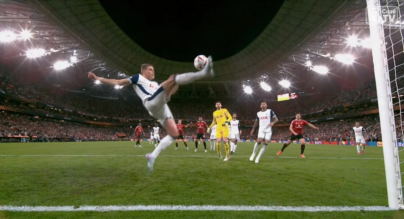 Micky van de Ven pulls off a MIRACULOUS acrobatic goal-line clearance to save Guglielmo Vicario's blushes and keep Spurs in charge of the Europa League final! pic.twitter.com/JMGbQ8rbD4