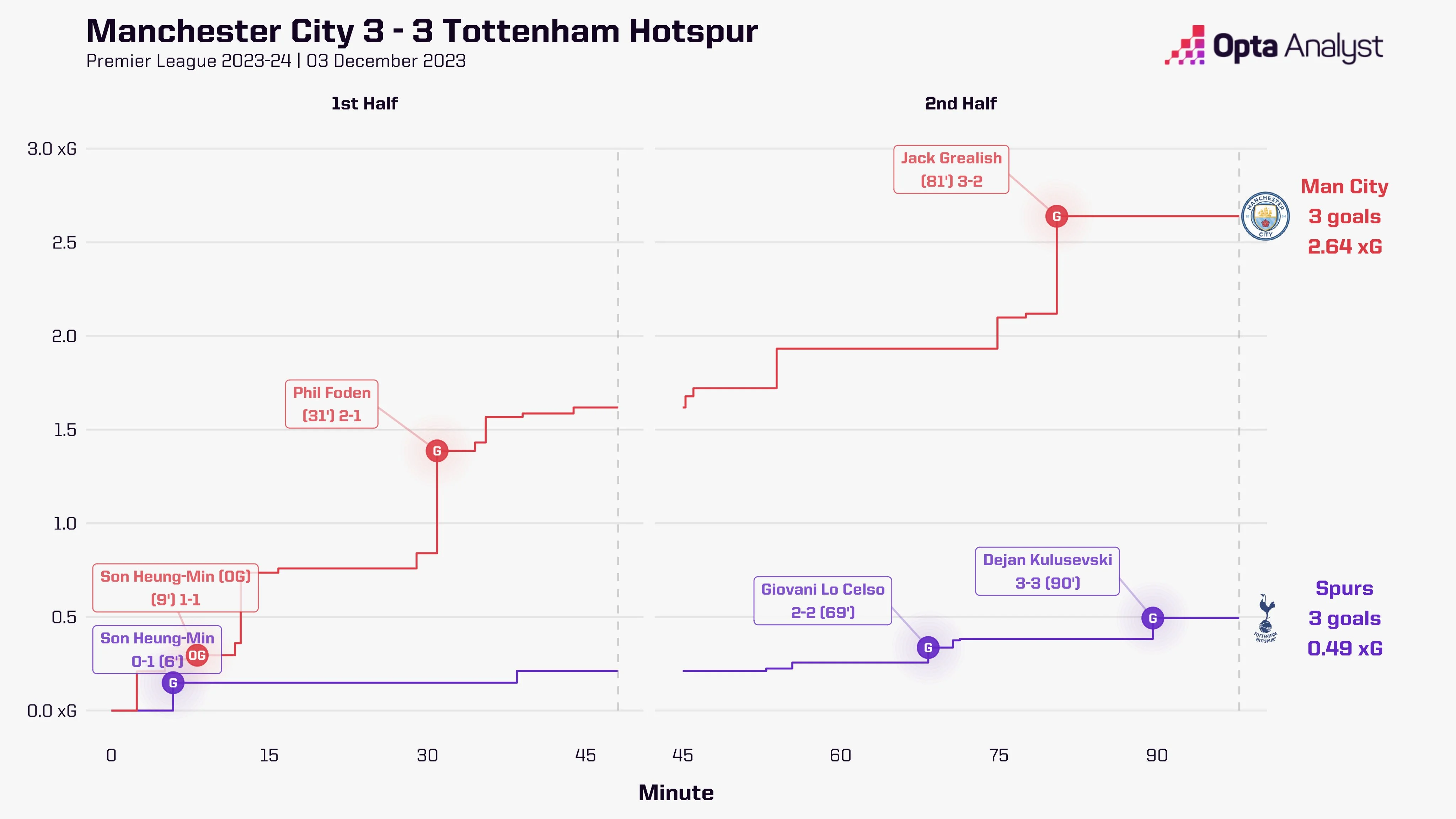 А на 9-й хвилині Сон відзначився ще раз. Манчестер Сіті заробив черговий стандарт, Альварес подав на Холанда, а той виконав скидку у воротарський майданчик. Кореєць же коліном підрізав м'яч у сітку власних воріт – 1:1. Між голом і автоголом Сона пройшло всього 137 секунд. За всю історію АПЛ забити своїм і чужим в перші 10 хвилин зміг тільки він і Гаретт Беррі з Астон Вілли у травні 1999-го.