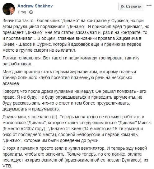 "Виходить так: я – вболівальник Динамо на контракті у Суркіса, але при цьому радію поразкам Динамо. Я завдавав шкоду Динамо, але президент мені ці статті замовляв і, якщо я на контракті, то і проплачував... Загалом, головні винуватці провалу Хацкевича в Києві – Шахов і Суркіс, який, до того ж, ще й премію за перше місце в групі смерті не виплатив. Логіка геніальна. Ось так він і нашу команду тренував, тактику розробляв...