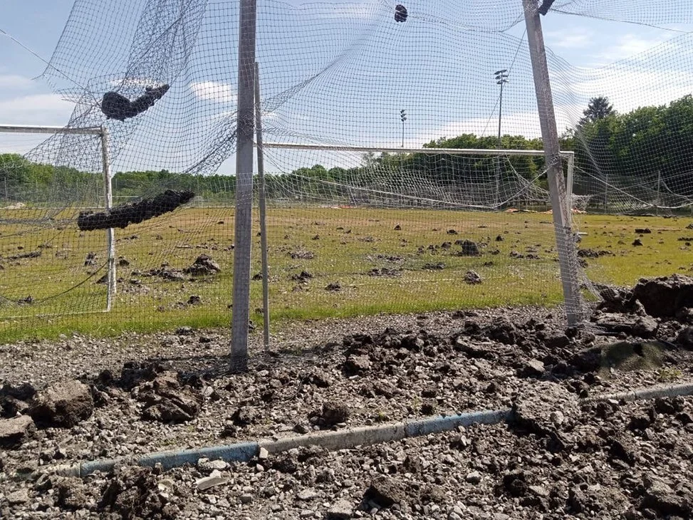 Дісталося і футбольним полям, які також зазнали ушкоджень. Вибух був такої сили, що залишки ґрунту розкидані в радіусі понад сто метрів від його епіцентру.