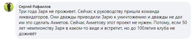 Тому, якщо 50 років чемпіонства (у 1972 році клуб ставав чемпіоном СРСР – прим.) Зоря в якомусь вигляді і зустріне, то до 100-річчя клубу (рік заснування – 1923-й – прим.) – не доживе", – написав Рафаїлов на своїй сторінці у соціальній мережі Facebook.