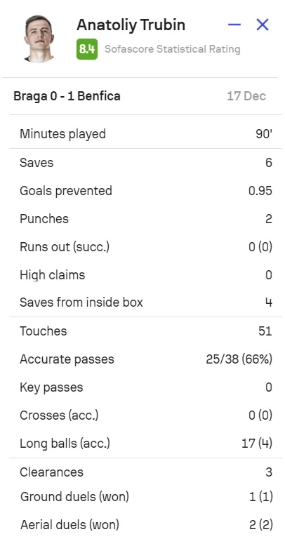 Бенфіка весь другий тайм відбивалася – 14:2 за ударами на користь Браги. Героїзм Трубіна допоміг вистояти. Бенфіка мінімально перемогла і піднялася на перше місце (33 очки). Анатолій отримав визнання від свого візаві (Матеус після гри особисто підійшов віддати компліменти) та став найкращим гравцем матчу!