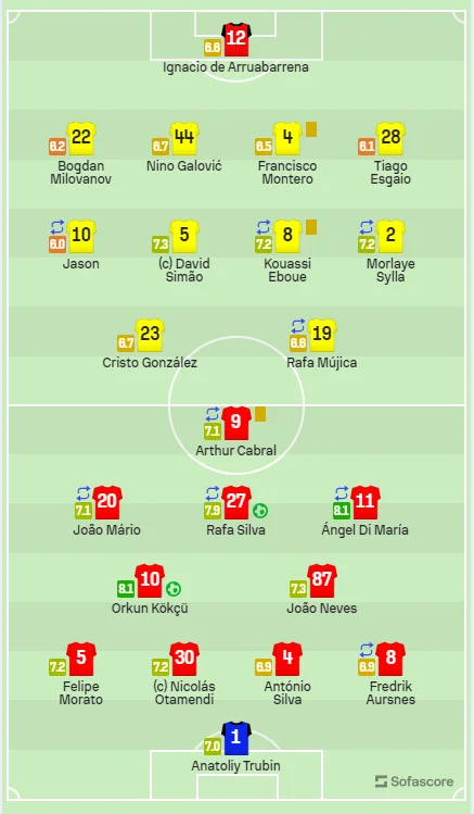 На 30-й хвилині "орли" забили вдруге, але гол Рафи Сілва знову вкрав офсайд. Зрештою, наприкінці тайму йому все-таки вдалось залишити безапеляційний автограф у воротах Аруки. 30-річний півзахисник отримав закидання у штрафний майданчик і спробував перекинути сферу через голкіпера – м'яч влучив воротарю у руку. Рятувати ворота побіг захисник, але програв боротьбу Сілві, який зумів проштовхнув сферу у сітку. Вже у доданий час господарі буквально розстрілювали Трубіна, але боковий суддя зафіксував положення поза грою і рахунок залишився без змін. Перед тим український кіпер врятував команду після виходу сам на сам.