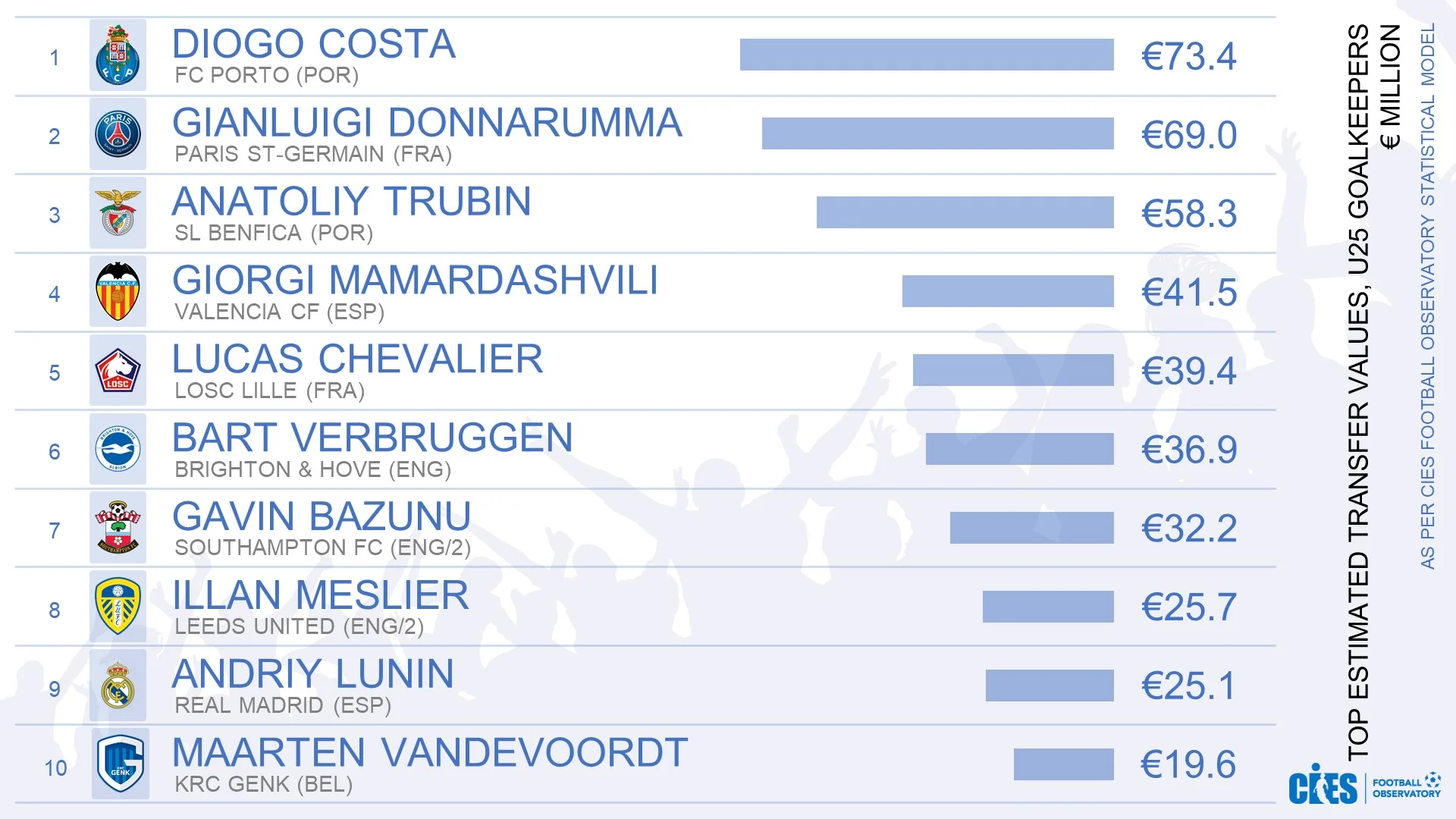 22-річний кіпер розташувався на третій сходинці, пропустивши вперед Діогу Кошту з Порту і Джанлуїджу Доннарумму з ПСЖ. Португальця оцінили у 73,4 млн євро, а італійця – у 69 мільйонів. Вартість Трубіна, згідно з підрахунками CIES, склала 58,3 млн євро.