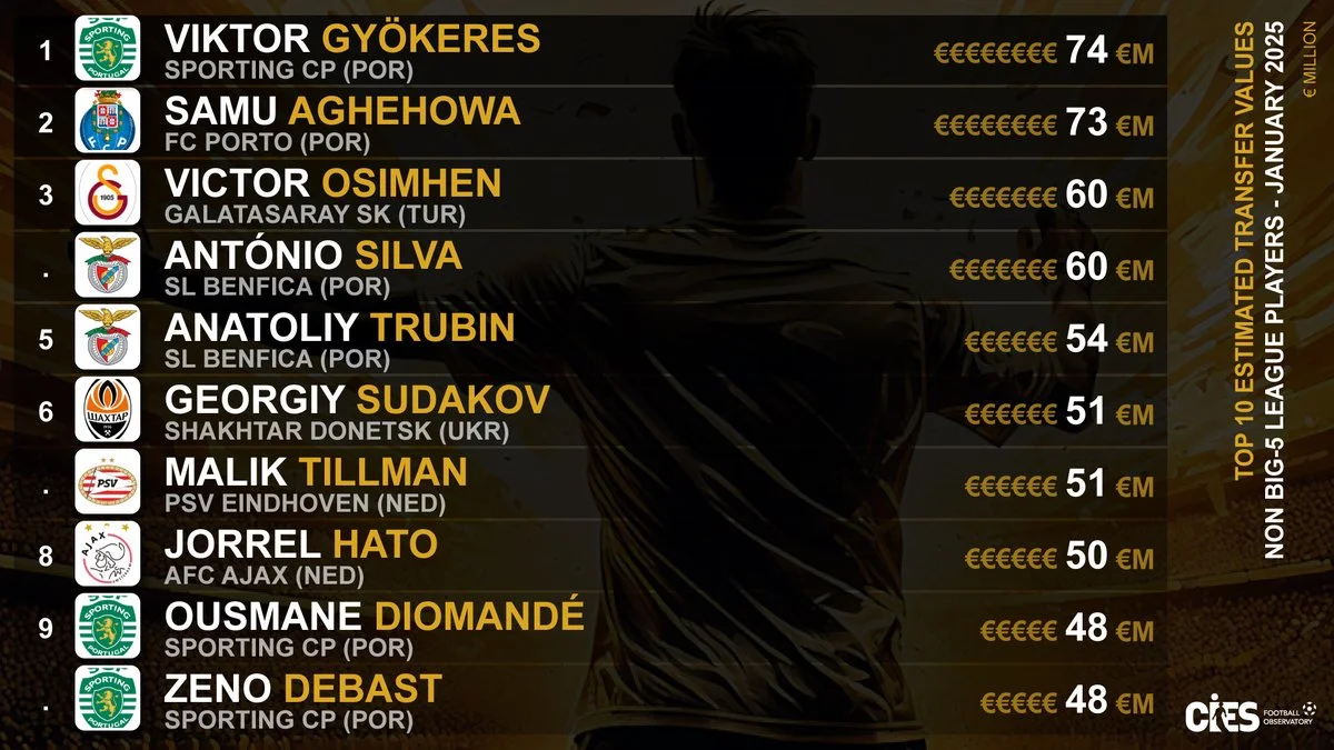 Міжнародний центр спортивних досліджень (CIES) оприлюднив рейтинг 10 найдорожчих футболістів, не враховуючи гравців з топ-5 європейських ліг.
