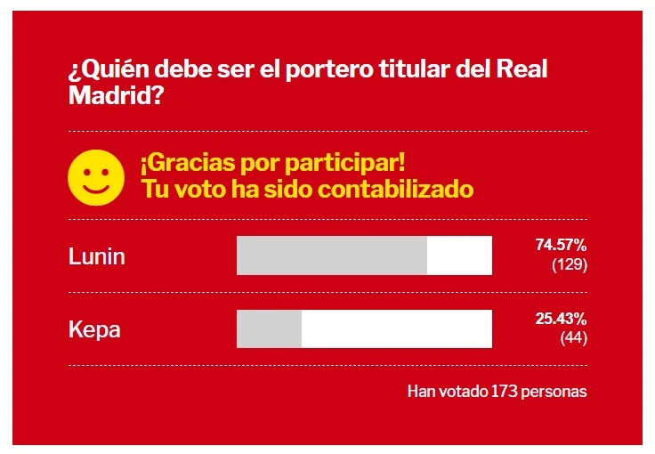 Солідарні з журналістами й читачі Mundo Deportivo. Майже 75% футбольних уболівальників, які взяли участь у голосуванні на сайті видання, вважають, що саме Андрій Лунін повинен бути основним голкіпером Реала.